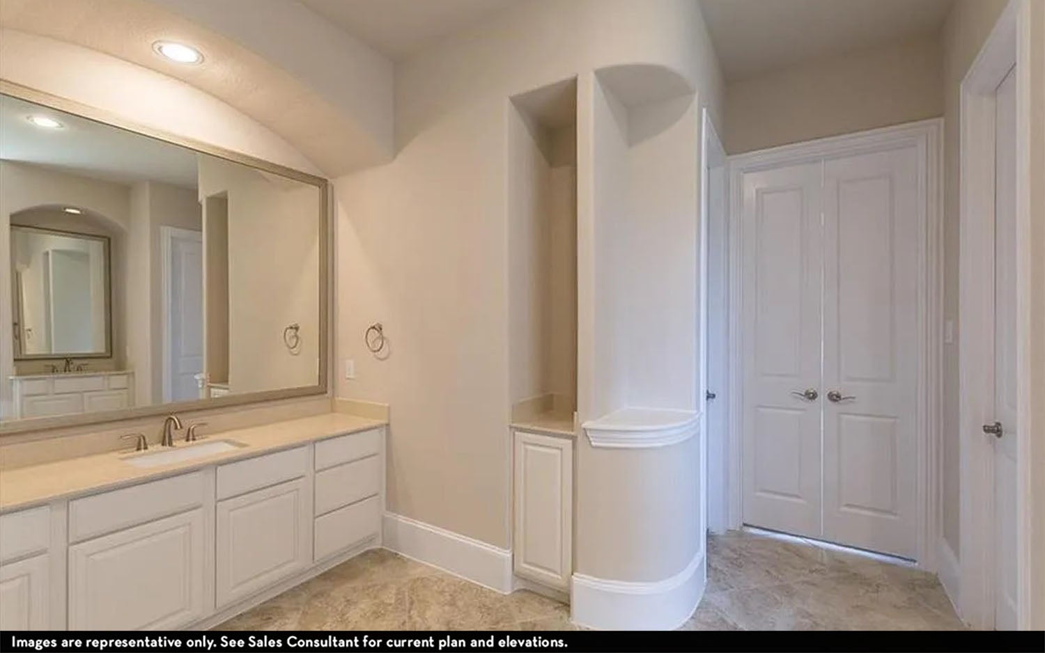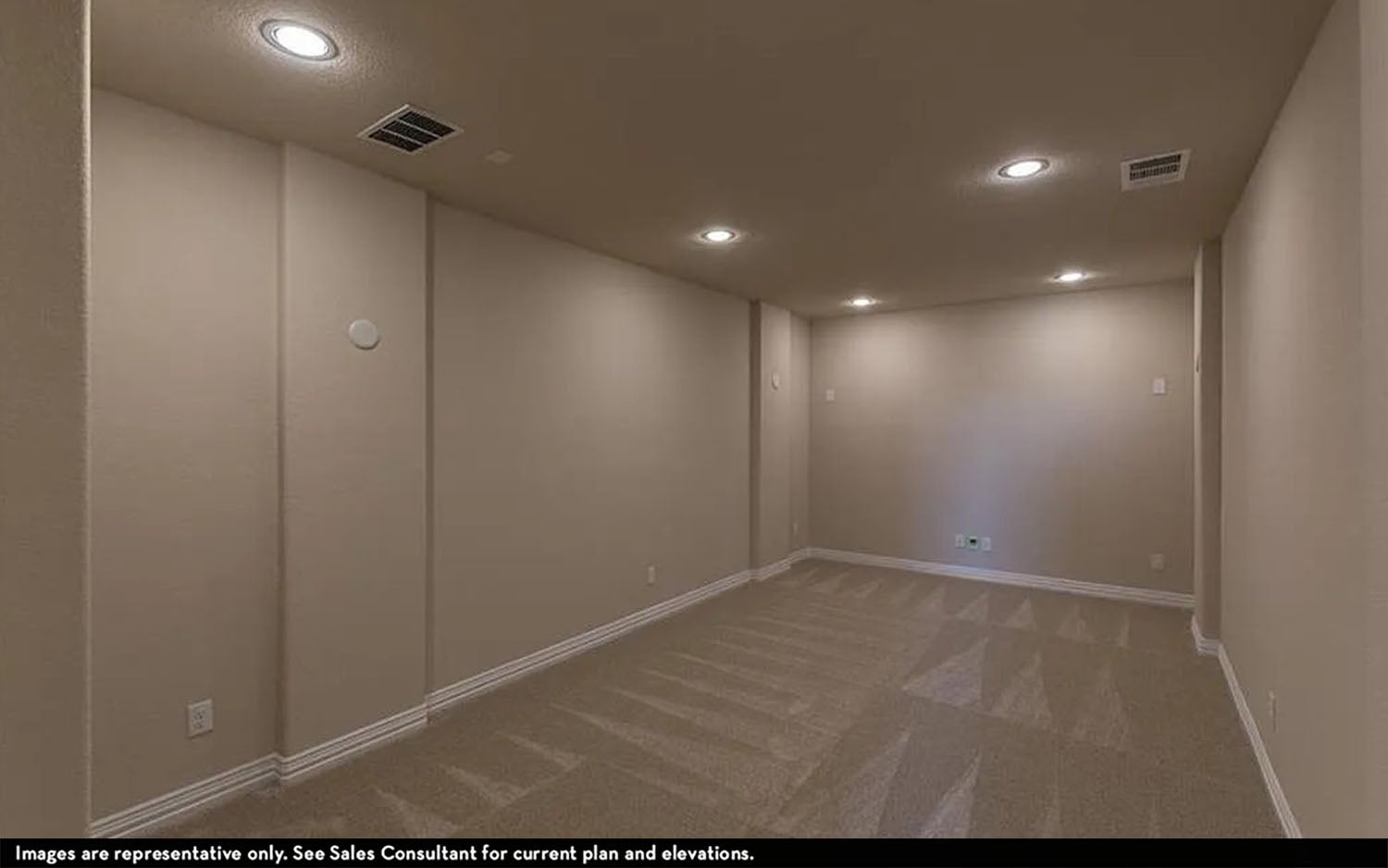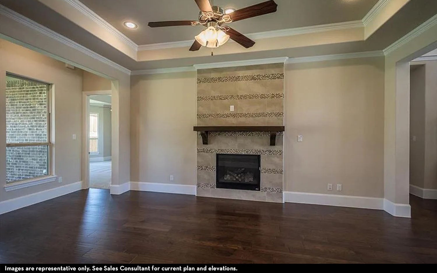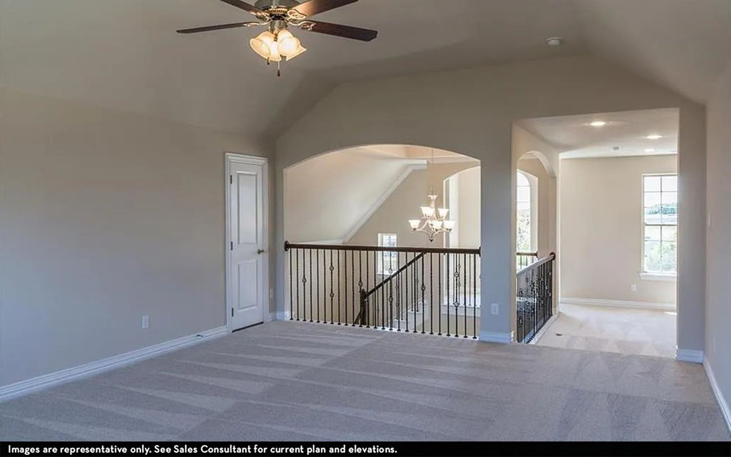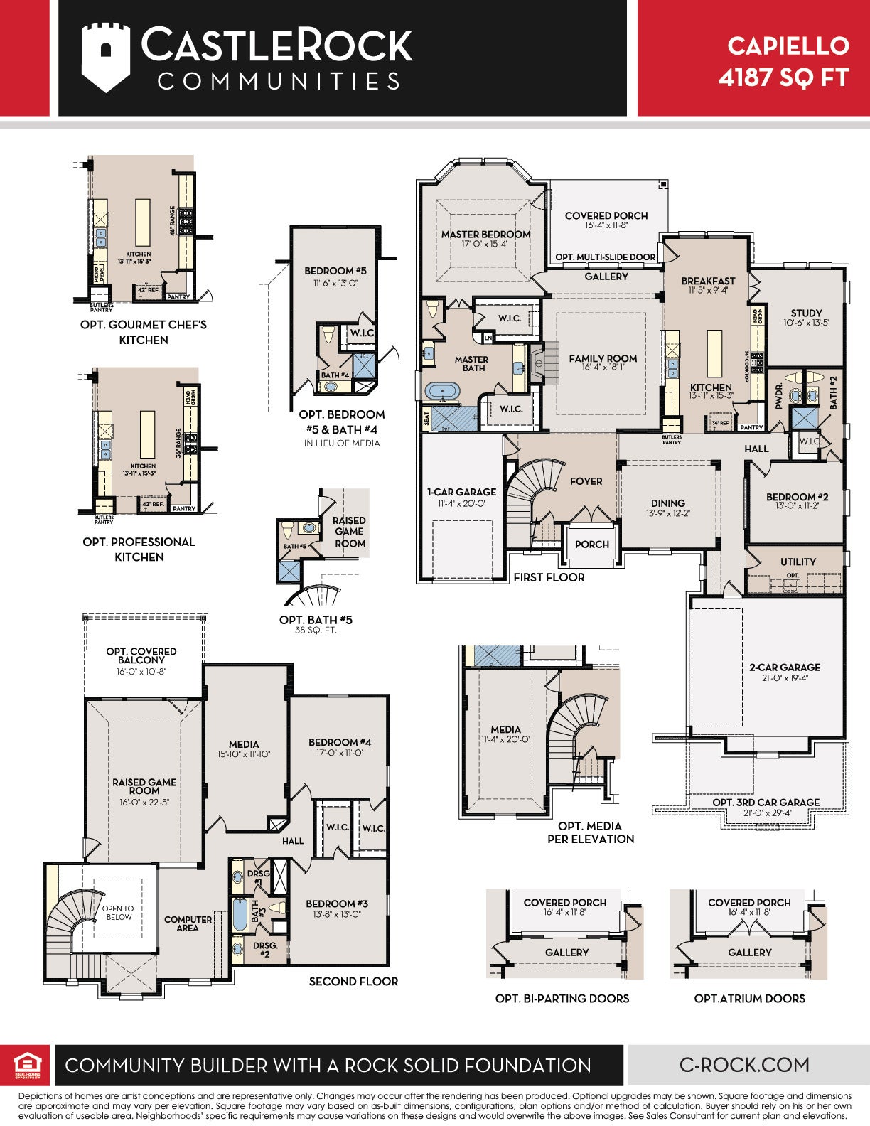 CastleRock’s most luxurious design offers oversized space in all areas of importance. With four bedrooms and three and a half baths, this home features enough space for the entire family. Upon entry, you are greeted by a grand foyer with a beautiful spiral staircase adding that extra flair. You are then met with the open-concept family room with a fireplace, and the inviting dining room. Around the corner from the dining space is your guest bedroom with a private bathroom and walk-in closet, as well as the grand utility room including a packing station, along with a space for a freezer and/or a utility sink with a folding area. In the family room, opt to include a multi-slide door for easy access to your expansive covered patio. From the family room, you are met with a quaint breakfast area and large kitchen with double ovens, a 36" cooktop, a long kitchen island with granite countertops and an oversized pantry for optimal storage. The kitchen can also transform into a professional kitchen with or gourmet chef's kitchen if you desire. You also have the option of a butler's pantry! Just beside the breakfast room is your private study room. Finally downstairs holds the gorgeous master suite with two spacious walk-in closets, a luxurious bathtub, an optional fireplace and a one-of-a-kind circular shower. Talk about living in luxury! Upstairs has its own raised gameroom, a cozy media room, a computer niche and two additional bedrooms each with walk-in closets. The third bathroom attaches to the third bedroom with two dressing areas and dual vanities. Right off the raised gameroom would be your optional covered balcony, large enough for all to enjoy! This fantastic home is completed with a two-car swing garage and a recessed single car garage providing excellent curb appeal. As you can see the Cappiello plan would not disappoint. Fit for most any lifestyle, your family will fall in love with everything this home has to offer. Welcome home to your new Cappiello home!