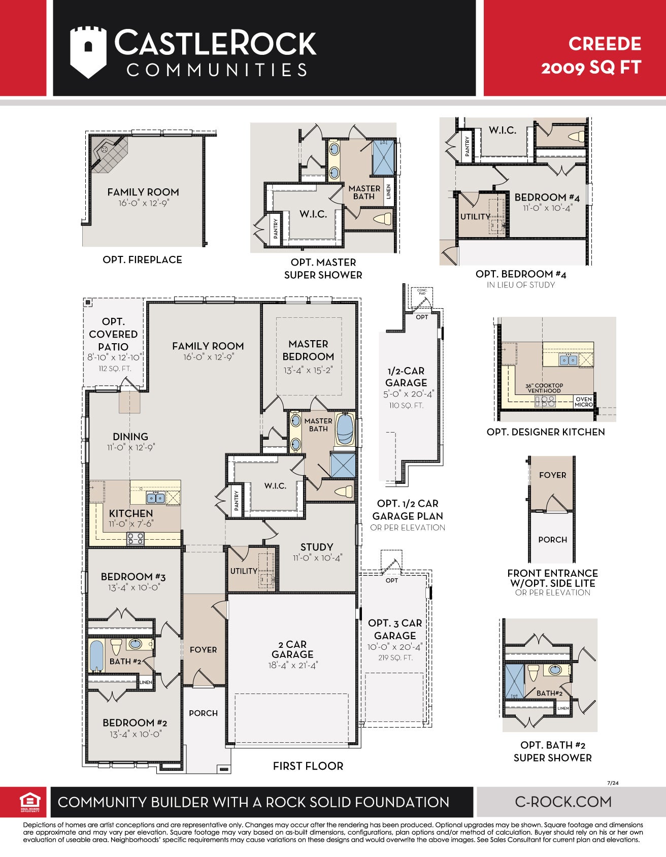 Boasting with space, the Creede plan is a highly sought-after one-story home with space for the whole family to enjoy. This three-bedroom, two-bathroom home is the perfect layout for most any lifestyle, no matter what stage of life you are in. Entering the home, you will find the long foyer leading to the second and third bedrooms, with the full secondary bathroom residing in the middle. Across the foyer lies the entry to your two-car garage. If you are yearning for more space to park a third car, or simply to store necessary items, decide to tack on an extra half-car or one-car garage! Proceed further down the hall where you will discover your walk-in utility room along with a secluded study room where you can work from home peacefully or choose to transform it into a fourth bedroom, if you are needing the extra space. Finally, at the back of the home, you are met with your combined living space. The open kitchen comes equipped with granite countertops, ample counter space, industry-leading appliances, and a pantry. It also opens up to the formal dining room and family room space, making this the perfect layout for entertaining guests. Add a stylish element to your family room by putting in an optional fireplace that will surely impress all of your family and friends. Right off the dining room, there is access to your backyard with the option to include a covered patio. Around the corner from the family room is your private master bedroom. Your refined master bathroom is complete with double vanities with LED down lighting, a bathtub and shower, and a substantially-sized walk-in closet. If you prefer a shower over a bathtub, you can opt to include a super shower in both the master bathroom or secondary bathroom instead! With plentiful included features and exclusive options available to you, the Creede floor plan is tailored to fit your lifestyle, wants, and needs the way you have always imagined. You will not ever have to sacrifice comfort with the Creede!