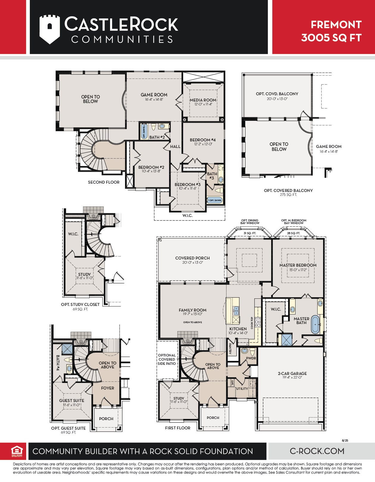 Bursting with originality, the Fremont offers an irresistible layout that will satisfy the entire family. Entering this grand home, you are met with the large, secluded study room that you can transform into a guest suite with adjoining bathroom, or opt for an oversized walk-in closet or a covered side patio! The abundance of opportunities is outstanding! Across from your sweeping staircase lies a convenient downstairs powder room, your walk-in utility room, and entry to your two-car garage. The heart of the home holds your two-story family room with a fireplace, and your combined kitchen and dining room space, perfect for welcoming gatherings of any size. Your kitchen is filled with luxury features like granite countertops, industry-leading appliances, and a large walk-in pantry. Add an extra flair to your dining room by adding bay windows, letting in every angle of natural light. For those who love hosting backyard barbecues, your included covered patio in the backyard is the ideal space for all your friends and family! Completing the first floor is your private master bedroom that you can add bay windows to, if you prefer. The master bathroom features dual separate vanities and sinks, a luxury bath with stand-alone shower, and a sprawling walk-in closet. Head up the grand staircase where you will find a gameroom that is open to the below family room and an attached media room that proves to be an amazing family movie night spot. An amazing option for the upstairs is to include a covered balcony for all your guests to enjoy. Additionally, you are met with the three remaining bedrooms and two full bathrooms. You and your family will never have to sacrifice space nor comfort in a floor plan like this one. The amount of desirable options and admirable included features that the expansive Fremont floor plan provides makes this one of the best four bedroom, three-and-a-half bath homes we offer. Your family will love and cherish living in your CastleRock Fremont home!