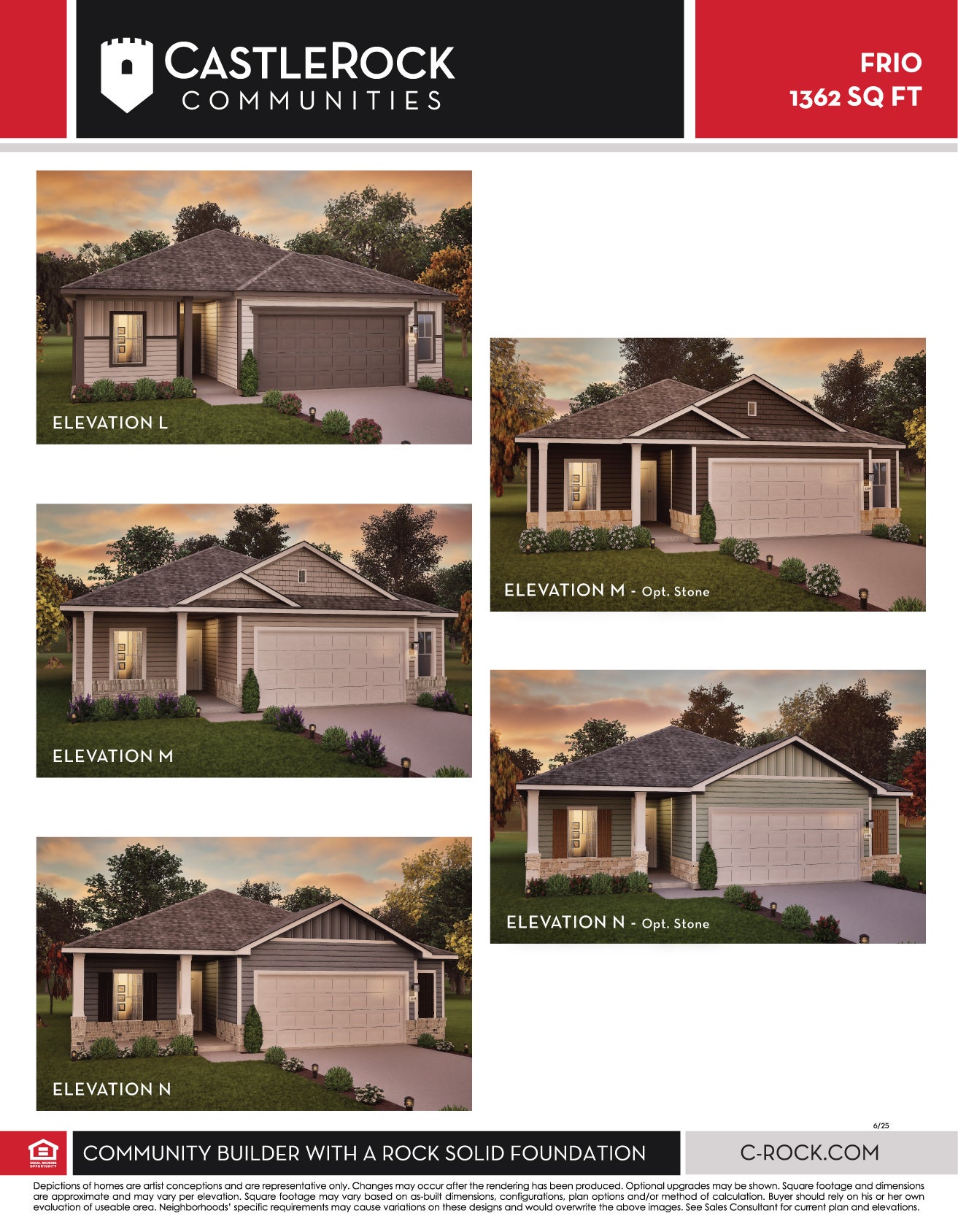 The Frio floor plan is as exciting for its features as it is for the tremendous value. A package of dynamite, this home boasts three bedrooms, two walk-in closets and two baths joined with a huge family room and a large kitchen/dining area. Upon entry of the home, you are met with access to your two-car garage. If you are needing the extra storage space, you are able to opt for an extra 1/2-car garage! You are then guided to the heart of the home - the sizable family room that faces the kitchen. This layout is ideal for hosting gatherings for all your friends and family. Opening up to the family room is your conveniently-designed kitchen and breakfast/dining room combination with entry to your walk-in utility room. The kitchen area is equipped with exclusive features like granite countertops, designer light fixtures, and flat-panel birch cabinets - these features alone are sure to please any crowd! Leading to your backyard from the breakfast/dining area, you can decide to include a covered patio if you like to get a breath of fresh air while being protected from the weather. The three large bedrooms are the perfect size for your family or guests when they come to visit. The second and third bedrooms are placed at the front of the home, with the third bedroom boasting a walk-in closet. The secondary bathroom lies conveniently between the two bedrooms. If you are looking to find the balance between work and play with a designated area to get things done, opt to transform the secondary bedroom into a study room! The option is yours. Lastly, the private master suite is secluded on the other end of the home and boasts a generously-sized master bathroom. The master bathroom is complete with cultured marble countertops with the option for dual vanities, a shower/bathtub enclosure, and a massive walk-in closet for you to enjoy! Upgrade your master bath to a master luxury bathtub with shower or an oversized super shower instead. You will cherish living in your Frio home!