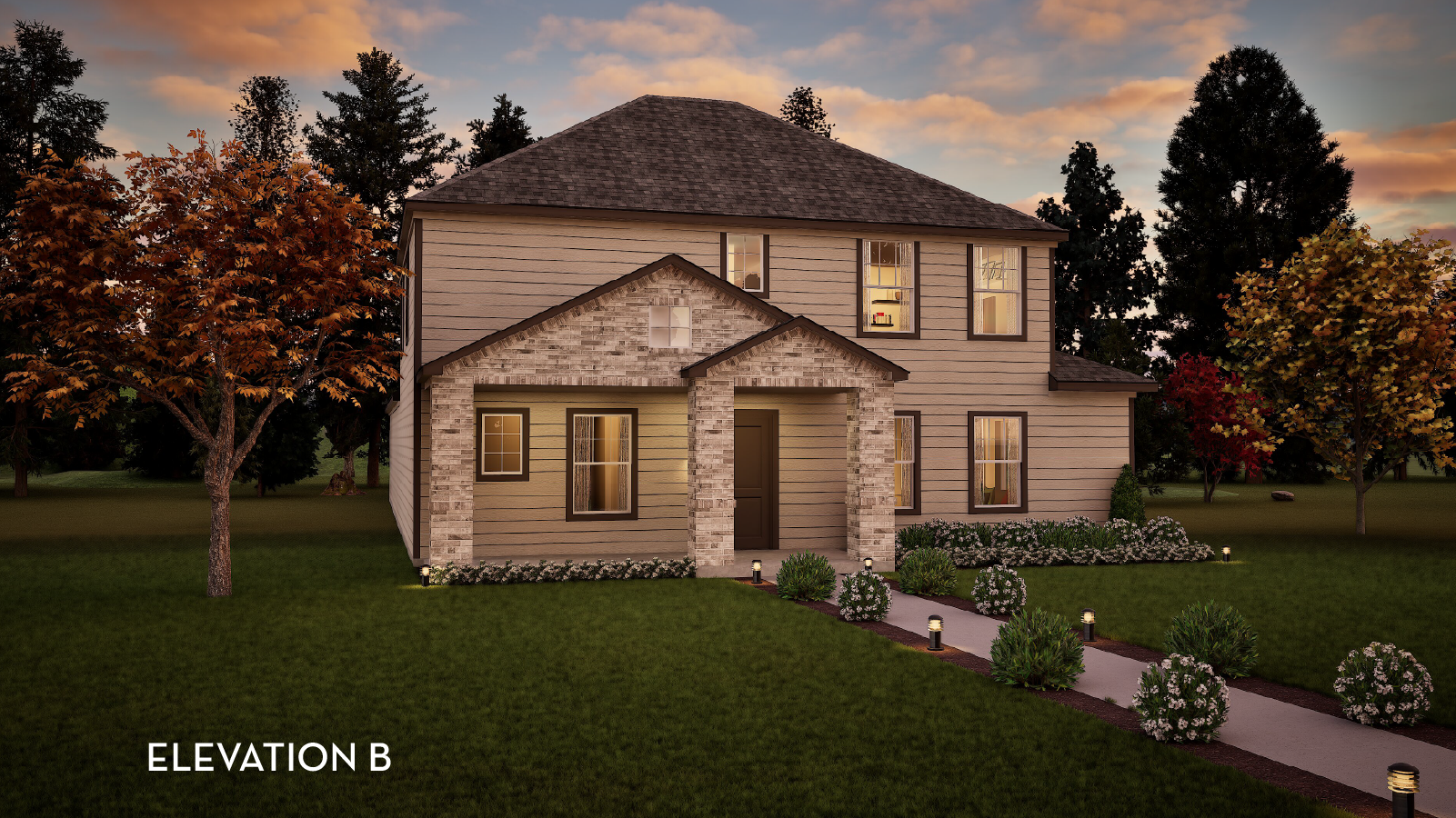 The wonderful, two-story Kimble home showcases an open-concept layout that is ideal for the lifestyle of most any family. For starters, the huge front porch provides stunning curb appeal, while serving as a useful space to sip your coffee in the mornings, watch the kids play, or chat with neighbors! Upon entering your home, you are met with the convenient downstairs powder room and the walk-in utility room. You are then greeted by the large, inviting family room, combined dining area & the kitchen, making this the perfect floor plan for entertaining guests. The kitchen is complete with sleek granite countertops, industry-leading appliances, designer light fixtures, and an optional kitchen island if you are needing more counterspace! The option is yours. Right off the dining area is the entry to your backyard. One of the backyard options includes an optional covered patio - perfect for relaxing outdoors with family or backyard barbecues. You also can decide to add a covered breezeway that leads directly to your two-car garage! You never have to sacrifice convenience with the Kimble plan. Down the hall resides the private master suite featuring three windows allowing optimal natural light, as well as a sizable walk-in closet. Your master bathroom features the option of dual vanities, cultured marble countertops, and a shower/bathtub enclosure. Enhance your master bathroom by opting for a master luxury bath with stand alone shower, or a master bathroom super shower - both with standard dual vanities! Head up the stairs, where you will approach your spacious gameroom that the kids will love. The gameroom is also accompanied by the three additional bedrooms - each containing walk-in closets - and a full secondary bathroom! The Kimble floor plan is filled with amenities and options that your entire family will be able to enjoy for years to come. You and your family will cherish having a beautiful, open-concept home like the Kimble to call home.