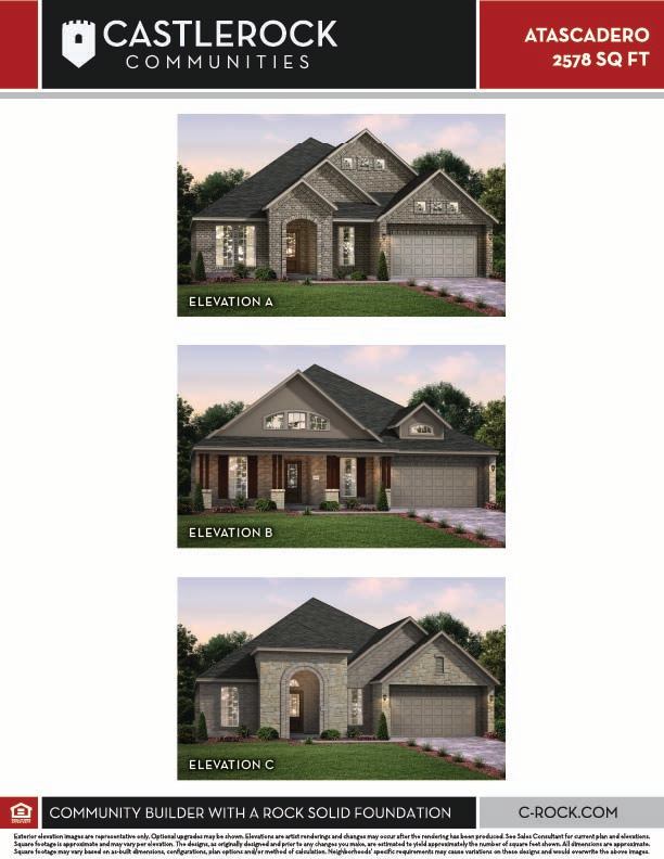 This one-story home offers everything you need while keeping your lifestyle low maintenance. Upon entering the home, you are greeted by the private study room. Down the foyer, you will come across the second and third bathroom, with the full secondary bathroom residing in the middle of the two. Both bedrooms have impressive walk-in closets, and a linen closet just outside the door giving you a great amount of storage. The large utility room just across the way serves you with more storage options like shelving and an optional cabinets. Spend quality family time or host a gathering in the expansive kitchen and family room. The grand kitchen area includes an oversized pantry, ample amount of granite counter space, as well as a large kitchen island, industry-leading appliances, and designer lighting. Sitting off the kitchen is an elegant dining space beaming with natural light. Wander to the spacious family room with a beautiful fireplace to keep you warm while adding a stylish touch to the area. Between the dining room and family room is the entrance to your spacious covered patio! You will love being able to spend time outdoors relaxing, cooking, or playing with the kids. The master suite is a secluded retreat with vaulted ceilings and a massive walk-in closet. Want to elevate the style of your bedroom? Opt to include bay windows for an extra flair. Leading off your bedroom, the master bathroom holds double vanities, a luxury tub and single shower. Let your imagination run wild with the endless options to customize your new home by adding on a second floor with a gameroom and media room or opt for a gameroom with a fourth bedroom with a walk-in closet. The choice is yours. You also have the ability to upgrade from your two-car garage to a 2.5- or three-car garage, and choose for it to be front load or side load! Customize your home how you've always imagined. With the expansive variety of options and included features, you will fall in love with your Atascadero home!