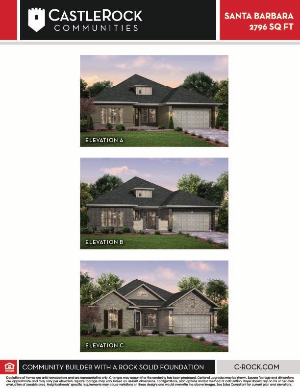 The Santa Barbara floor plan is a single-story plan with a three-car tandem garage, three bedrooms, and two-and-a-half bathrooms. A dynamite home loaded with personality! Entering this home, you are met with your secondary and third bedrooms with the full secondary bathroom residing between the two. In your secondary bathroom, you are given the option to swap your standard bathtub/shower for a super shower instead! Across the bedrooms is a flex living space, as well as entry to your powder bathroom, walk-in utility room, and your two-car tandem garage giving your maximum storage space. At the heart of your home, the combined formal dining room and spacious family room reside, and they also open up to your integrated kitchen and breakfast space providing optimal convenience for the entire family. The layout of these rooms proves to be the perfect space for hosting friends for dinner parties or your family for the holidays. Your kitchen boasts incredible features like a spacious island, granite countertops, industry-leading appliances, and a walk-in pantry. Off your breakfast room is entry to your massive covered patio, perfect for backyard barbecues. Completing this home is your private master suite with the option of adding a bay window to your bedroom, letting as much natural light in as possible. Your master bathroom consists of dual vanities and an expansive walk-in closet. As if this home did not boast plenty of desirable traits already, the Santa Barbara plan is filled with options that will tailor to your family's needs. For example, you can ditch the gym and work out in your personal exercise area in between your bathroom and closet. Additionally, you can choose to transform part of the tandem garage into a fourth bedroom and third bathroom, or an office/media room. Lastly, you can even choose to include a second floor that would boast a game room and media room for your whole family to enjoy. Rest assured, you will love living in the Santa Barbara home!