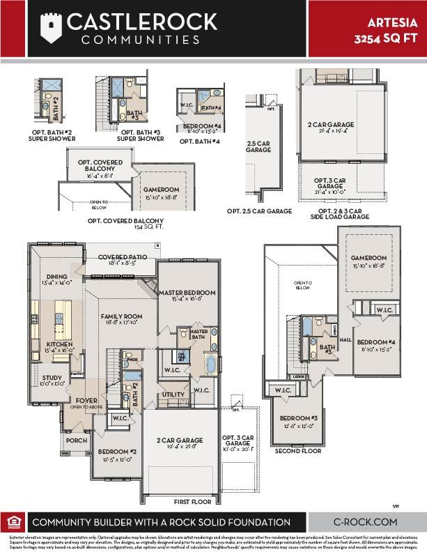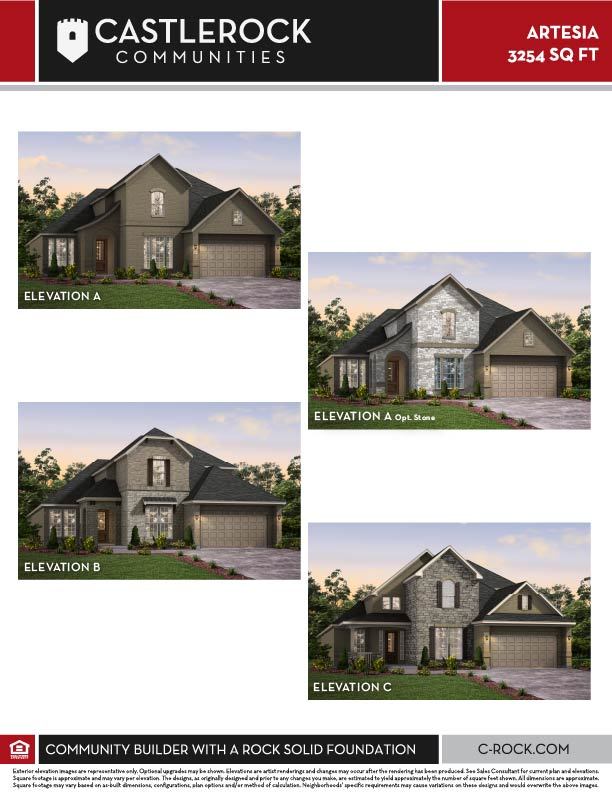 The Artesia is nothing less than captivating. Boasting a two-car garage, you can decide to make it a 2.5- or 3-car garage, or even a side load! This home sits on a greenbelt lot. Inside of this two-story home, you are welcomed home with a bright and airy foyer that guides you directly to the study room and the secondary bedroom, complete with a large walk-in closet. Attached to the secondary bedroom is the full secondary bathroom. Want to elevate your guest bathroom a bit more? Opt to turn the secondary bathroom tub into a large super shower. Straight ahead from the foyer, you are led to the to the open-concept kitchen, family and dining space. The spacious kitchen includes a long kitchen island, giving you ample amount of counter space! Add some barstools for the kids to eat their meals on, or use it to place all entrees & side dishes for your elaborate dinner party. With granite countertops, and beautifully-designed cabinets, you are sure to impress any crowd. In open-concept fashion, your family and friends can enjoy your 2-story family room boasting with space and complete with an elegant gas log fireplace, perfect for entertaining. The inviting formal dining room is also just beside the kitchen, so you will always be able to keep the conversations flowing. The door leading to your backyard takes you to your included covered patio - you will love the extra space you have to play with kids, or lounge with your guests. Finally, leading off from the massive family room, you will come across the secluded Master Suite with the half bathroom, and the utility room belonging just down the hallway. Your luxurious master suite bathroom consists of double vanities/sinks with a soaking bathtub, a single shower, and an impressive walk-in closet. Wander upstairs, and you will find the third and fourth bedrooms, with walk-in closets, as well as another full bathroom and a gameroom for all your family fun. You can add extra flair with a covered balcony if you'd like! The options are endless with the Artesia!