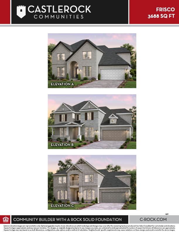 The elegant Frisco floor plan offers something for the whole family to enjoy. This five-bedroom, four-bathroom home is more than enough room for the whole family. Entering the grand foyer, you are led to the guest bedroom complete with a walk-in closet, with the full secondary bathroom residing just across the hall. On the opposite end is your sweeping staircase and a secluded study room. Take delight in the two-story family room with a stylish fireplace, and an inviting dining room and kitchen area with a large walk-in pantry included. Your kitchen also boasts desirable features like granite countertops, birch cabinets, industry-leading appliances, and designer light fixtures. Around the corner lies your walk-in utility room with entry to your two-car tandem garage. Need more space? Opt to include space for a third car or transform the tandem into a sixth bedroom with connecting bathroom for your guests! The opportunities are endless. Your covered patio is the perfect outdoor sanctuary for you and your family to relax under. When it's time for rest, retreat to your private master suite that you have the option of adding a bay window, letting optimal natural light seep through. Your amazing master bath boasts dual vanities with sinks, two walk-in closets, a luxury bath and a stand-alone shower. Talk about maximizing the space! Up the eye-catching staircase, you are greeted by a spacious game room the kids will love, as well as a media room that is perfect for a movie night at home. You will never have to wonder if there are enough space for guests since three more bedrooms reside upstairs, along with two full secondary bathrooms. This beautiful floor plan brings an open-concept feel that is convenient for anyone who walks through the doors. As soon as you enter this home, you will see for yourself the flowing layout and designer touches that make this floor plan stand out. With the amount of options available, personalize the Frisco how you've always dreamed!