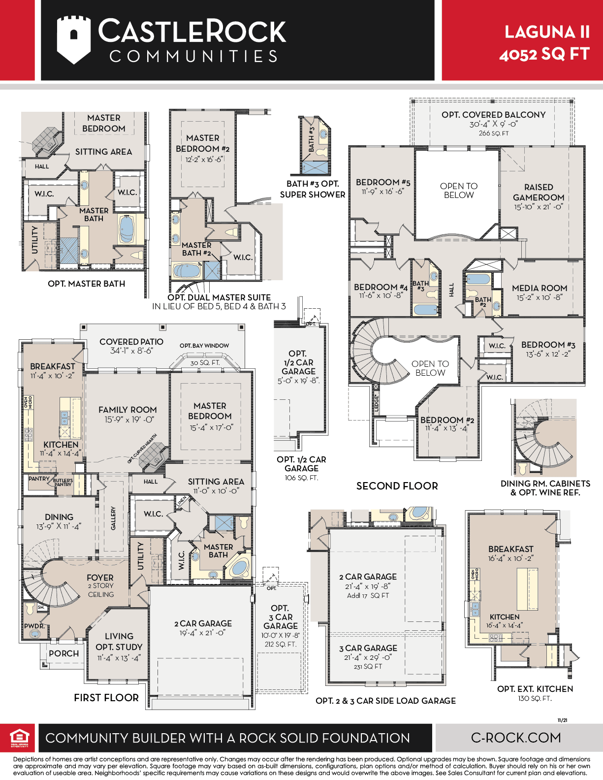 The pinnacle of luxury living is found in this five-bedroom, three-and-a-half bathroom, 4,052-square foot Laguna II floor plan. The dramatic entry showcases a sweeping staircase with two Juliet overlooks, a convenient downstairs powder room, your walk-in utility room, and entry to a secluding living space that you can turn into a study room. You also have the option of expanding your two-car garage into a 2.5 or three-car garage, front or side load. A gallery sets the tone for an inviting dining room and a two-story family room that opens to an island kitchen and adjoined breakfast area, providing optimal convenience. The formal dining room is the perfect spot to host guests since you have the option of including cabinets and a wine refrigerator. Your kitchen boasts plenty of attractive features such as granite countertops, industry-leading appliances, and a walk-in pantry with an added butler's pantry! With this luxurious floor plan, you can even opt to extend your kitchen into a platinum kitchen with dual islands. For the outdoor enthusiasts, the included covered patio is the perfect escape. The master suite boasts a reading alcove, while the master bathroom holds dual walk-in closets and sinks. Elevate your master suite by adding a bay window allowing for abundant natural light, separating the vanities in the master bathroom or opting for a secondary master bedroom/bathroom on the first floor. Travel upstairs where you have plenty to look forward to! The second floor boasts four large bedrooms, three walk-in closets, two bathrooms, a raised gameroom and a cozy media room give you plenty to look forward to upstairs. You are also granted two full bathrooms, as well as the option for a covered balcony off the gameroom. The variety of possibilities and options that the Laguna II floor plan offers allow you to personalize this home to your family’s desires. With this layout, you will remain comfortable no matter how many family members or guests reside in your home.