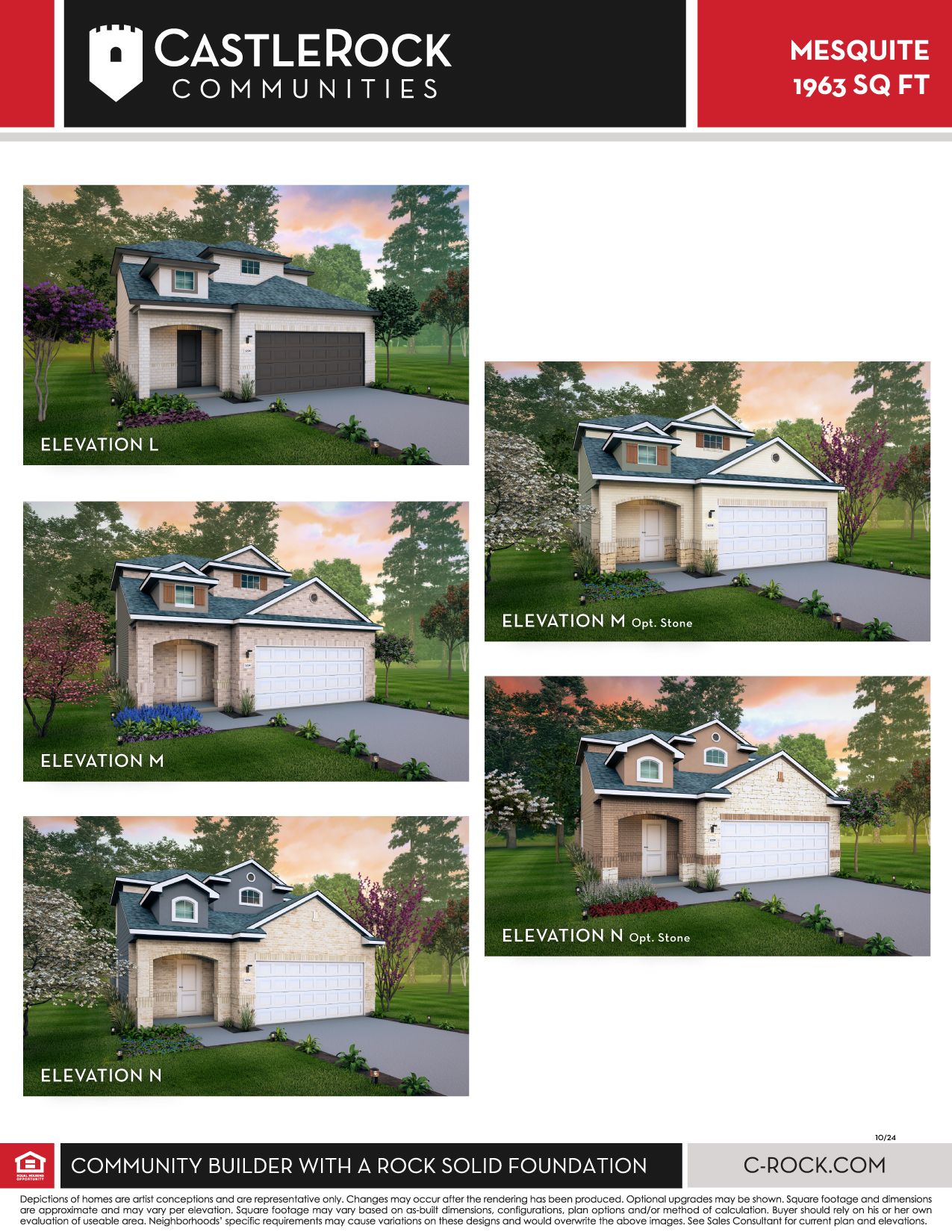 The uniquely-designed, two-story Mesquite floor plan holds three bedrooms and two-and a half bathrooms, the perfect home for most any lifestyle. Upon entering your new Mesquite home, you will discover your convenient entry closet, the downstairs powder room, and access to your two-car garage. Following down the foyer, you are met by your spacious family room and stairway access to the second floor. Your walk-in utility room and kitchen opens up to the family room, while the formal dining area is ideal for hosting dinners with the entire family, fully embracing the open-concept layout. Your kitchen boasts an immense amount of space complete with granite countertops paired with a ceramic tile backsplash, flat-panel birch cabinets, designer light fixtures, a large walk-in pantry, and a kitchen island! Head across your dining room to your backyard, where you are met with the optional covered patio - perfect for backyard barbecues. When it's time to rest, wander to your private master suite accompanied by cultured marble countertops, a luxurious super shower, as well as your sizable walk-in closet. You will never have to compromise your space and comfort with the Mesquite floor plan. Head upstairs where you will come across the two additional bathrooms, and the full secondary bath across the hall from the bedrooms. Your CastleRock Mesquite home is built with you and your family's well-being in mind. That's why each of our homes are Energy Star Certified, providing you with energy-efficient features enveloped in your home. Energy-efficient features like low E3 windows, third-party inspected insulation, and high-efficiency light fixtures all help to keep you comfortable in your new home. With the exclusive features and favorable options included in the Mesquite plan, we know you and your family will love calling this practical, open-concept plan home.