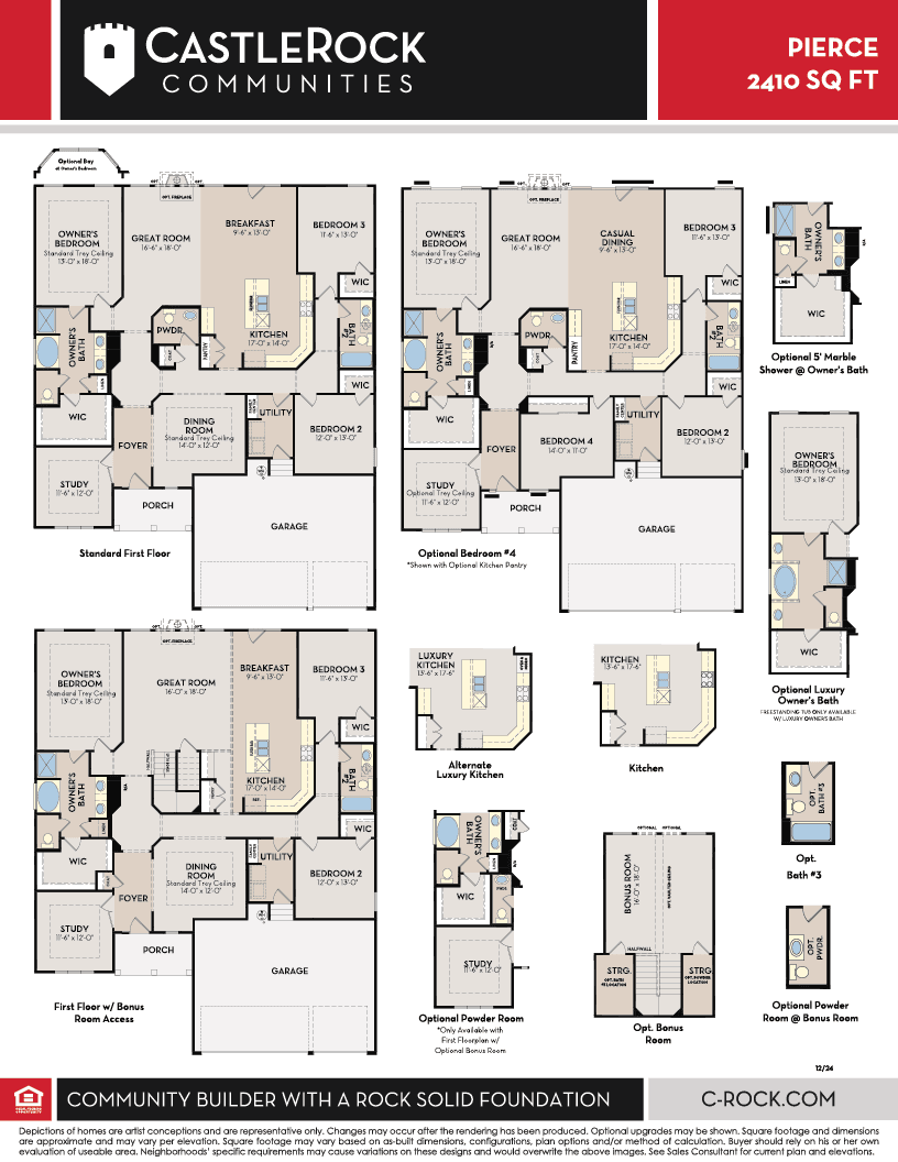 The Pierce floor plan is a stunning three-bedroom, two-and-a-half bath, single-story home with a 3-car garage and an impressive 2,410 sq ft of living space. This beautiful home features a front porch that adds character and charm from the moment you arrive. Step inside to find a formal study with French doors, perfect for those who work from home or desire a quiet space for reading and relaxing. The foyer also leads to a formal dining room with a trey ceiling, providing an elegant space for hosting dinner parties and gatherings. The first floor boasts an exquisite master suite complete with a trey ceiling, luxurious bath, and walk-in closet. This private retreat offers ultimate comfort and relaxation. Additionally, there are extensive cabinets throughout the kitchen, including an optional bank of cabinets on the side wall that creates a convenient cabinet pantry for all your storage needs. One of the highlights of the Pierce home is the open-concept design that seamlessly connects the great room, breakfast area, and kitchen. This creates an inviting atmosphere where friends and family can gather, whether it's for casual conversations or entertaining guests. Optional features include a bay window in the master suite, adding extra charm and natural light to this already stunning space. You can also choose to add a fireplace for cozy evenings during colder months or an optional bonus room if you require additional flexible living space. There is even the possibility of adding another bedroom if your family needs more sleeping quarters or guest accommodations. The Pierce plan is designed with both style and functionality in mind. With its thoughtful layout and high-quality finishes, this home is sure to exceed your expectations. Don't miss out on owning your dream home - come explore the Pierce home today!