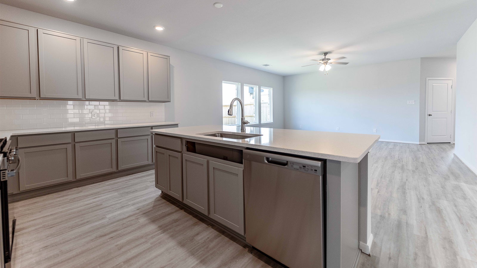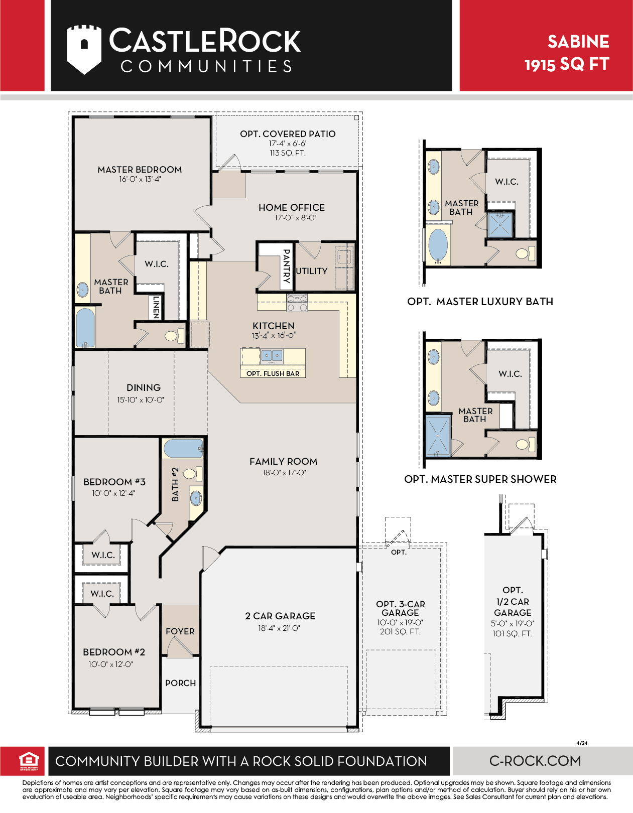 The gorgeous Sabine floor plan is a one-story home with an ideal layout that will suit most any lifestyle. Entering this lovely home, you are met with the second and third bedrooms, each boasting convenient walk-in closets, as well as entry to the full secondary bath residing right beside the third bedroom. Also at the front of the home is entrance to your two-car garage. If you are needing more space to store tools or holiday decorations, opt to include an extra five feet, making it a two-and-a half car garage. Down the hall lies the massive family room, formal dining room, and the huge kitchen - this entire living area is perfect for hosting dinner parties and family gatherings of any size! Your kitchen is equipped with ample counterspace featuring granite countertops, convenient kitchen island for more counterspace, industry-leading appliances, as well as an oversized pantry with your walk-in utility room just around the corner. Facing the utility room is your secluded home office - a private nook for the kids to finish their homework. If you love relaxing outdoors or grilling out for family and friends, you will love having an optional covered patio to experience those activities. Privacy is no worry when it comes to the master bedroom and bathroom at the back of the home. Your master bathroom includes cultured marble countertops with the option of dual vanities, a shower/bathtub enclosure, as well as a large walk-in closet! Elevate your master bathroom style and functionality by replacing the standard shower/bathtub enclosure with a luxury bath or super shower instead! The Sabine gives you plenty of unique opportunities to be able to personalize your home how you have always imagined. In the Sabine plan, you will appreciate the convenient, open-concept layout that gives you the perfect amount of space, no matter what stage of life you are going through. If you are looking for an accommodating, flexible floor plan for your family, then the Sabine is for you!