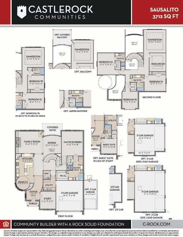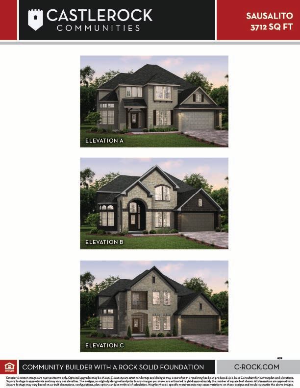 The Sausalito floor plan is a sophisticated design packed with custom elements. The rounded breakfast area, spiral staircase, and two story dining room make an impressive statement in this stunning four bedroom design. Entering this home, you are met with a secluded study room that you can turn into a guest suite with an attached bathroom and walk-in closet. Next you are greeted by the integrated kitchen and breakfast area that opens up to the formal dining and large family room, making entertaining guests a breeze. Your kitchen features many attractive elements like granite countertops, a kitchen island, and a spacious pantry. For those who like to spend ample time outdoors, the large covered patio is the perfect sanctuary for you to relax under. Adjacent to your beautiful sweeping staircase is your convenient downstairs powder bathroom, as well as your walk-in utility room and access to your two-car garage. Choose to expand your garage by including space for a third vehicle or a half-space for additional storage. You can also choose to have a two or three-car side load garage instead. Retreat to your master suite that gives you the option of including a bay window allowing for abundant natural light to seep through. The master en-suite bathroom features double walk-in closets, dual vanities, and a large soaker tub with a separate shower. Wander to the second story where you will discover a gameroom that the kids will love, a secondary bathroom, and a cozy media room that is perfect for family movie nights at home. You will also find the third bedroom and the fourth bedroom with an attached full bathroom and each containing walk-in closets. You can also swap out the secondary bathroom tub/shower into a super shower if you prefer! Needing an extra bedroom for guests? Switch out the media room for a fifth bedroom and fourth bathroom to accommodate your needs. You can also include a covered balcony for everyone to enjoy!. You will love living in your Sausalito home!