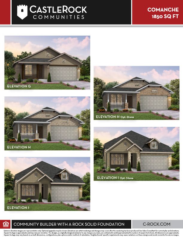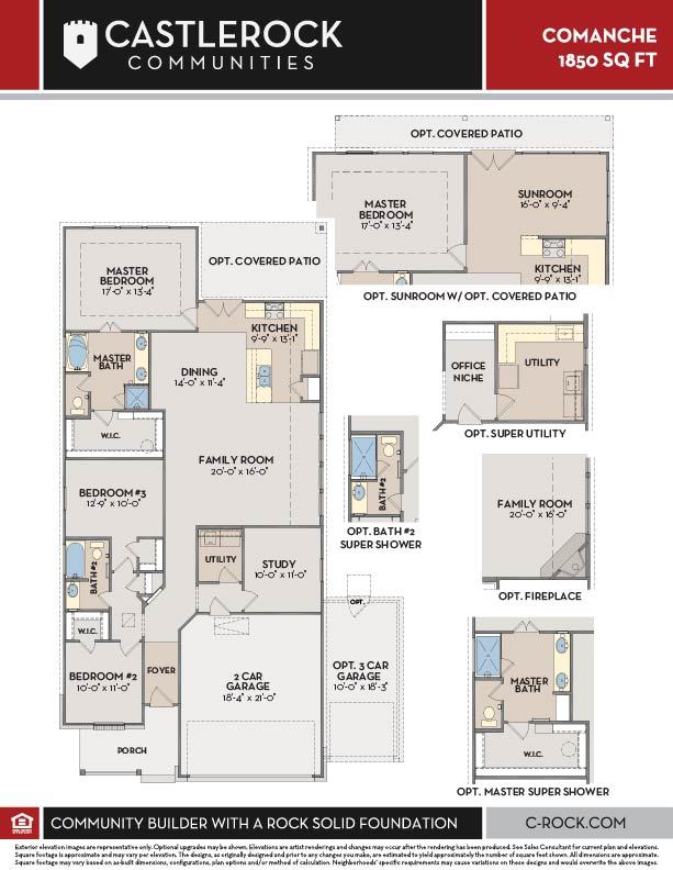The charming Comanche plan is perfect for every type of lifestyle. Embracing the open-concept layout, this three-bedroom, two-bathroom home allows for optimal space. The front of the home provides a quaint covered front porch, perfect for relaxing and sipping coffee in the mornings, or visiting with your neighbors. Upon entry, you are greeted by the foyer that first leads to the second and third bedrooms - each boasting walk-in closets, as well as the full secondary bathroom complete with a single vanity and a shower/bathtub enclosure that you can swap for a super shower, if you desire. Then, you are led to a short hallway that grants access to the walk-in utility room, the secluded study room, and the two-car garage. Need more space for another car or to store other necessary items? Opt for a third-car garage instead! You can also supersize your utility to maximize your space and turn the study into a smaller office niche - the choice is yours. Around the corner, you are then met with the sprawling combined family room with the option for a stylish fireplace and the dining area that opens up directly to the kitchen. With this layout, you will never worry about missing out on the fun with your guests! Boasting exclusive features, the kitchen includes ample counterspace with granite countertops, flat-panel birch cabinets, and designer light fixtures. With access from your kitchen, you will be led to your optional covered patio. Are you a fan of natural light streaming in as much as possible? Choose to include an optional sunroom with your covered patio stretching across the sunroom and master bedroom! Finally, retreat to your master bedroom with attached master bathroom containing a bathtub, single shower, double vanities with LED down lighting, and an enormous walk-in closet! You also have the ability to transform your bathtub into a super shower, if you like. There's something for every lifestyle in the Comanche - you can not go wrong with this plan!