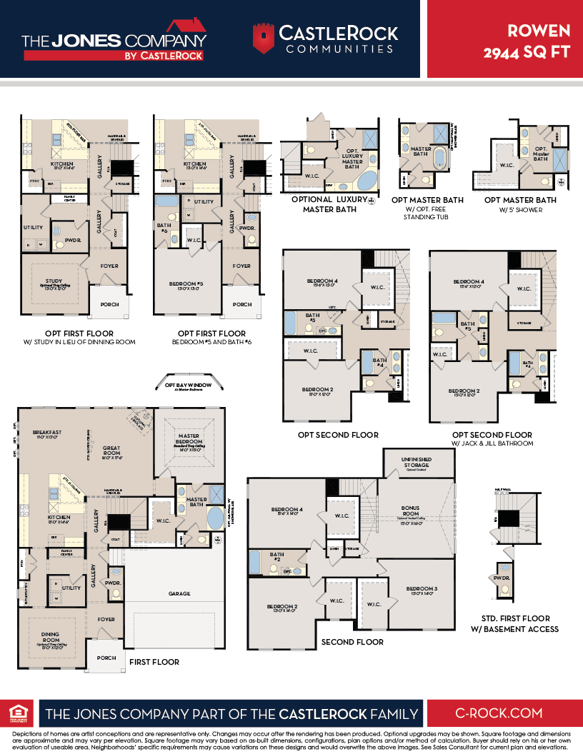 The uniquely designed Rowen floor plan exudes elegance and offers a spacious layout perfectly designed for modern living. With 2,944 sq. ft., four bedrooms, and two-and-a-half bathrooms, this home is an oasis of comfort and functionality. Step inside and be greeted by the formal dining room with an optional trey ceiling, adding architectural interest to your dining experience. Following the convenient powder room and gallery, you're met with the communal living areas. The great room offers an inviting area for gatherings and entertainment. The kitchen provides ample space for culinary adventures while the breakfast area offers a cozy spot for casual dining. Functionality in the Rowen doesn't stop there - it also includes a family center, utility area, and an unfinished storage room for added convenience. You have the option to finish the storage room according to your needs. Additionally, the master suite resides on the first floor, boasting a generous size of 14'-0" x 15'-0" and featuring a trey ceiling, this bedroom offers a peaceful haven to unwind. Imagine waking up to the soft morning light streaming through the optional bay window, creating a serene ambiance. Connected to the master bedroom is the en-suite bathroom, an extension of luxury. Picture yourself soaking in the optional free-standing tub, enjoying moments of relaxation and tranquility. Additional bedrooms and bathrooms are thoughtfully designed to accommodate your family's needs. Bedroom 4 can potentially feature a vaulted ceiling. Optional bedrooms 2 and 3 offer flexibility for guests or family members. Customization options include additional bathrooms and walk-in closets attached to these bedrooms. With its versatile floor plan and a range of optional features like the With its versatile floor plan and a range of optional features, this home allows you to create a space that truly reflects your unique style.