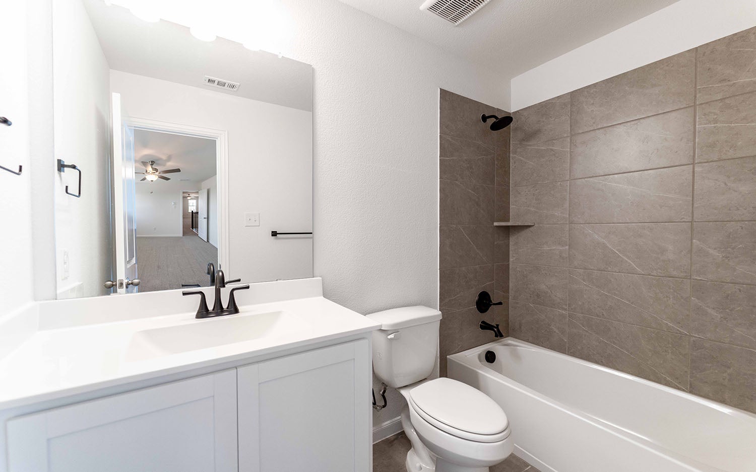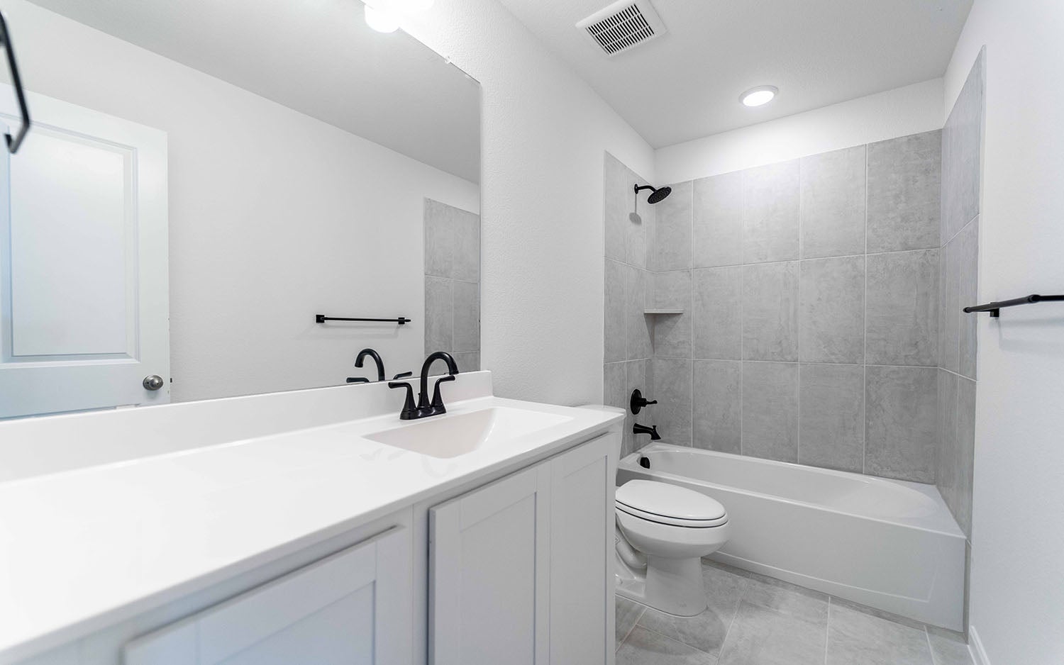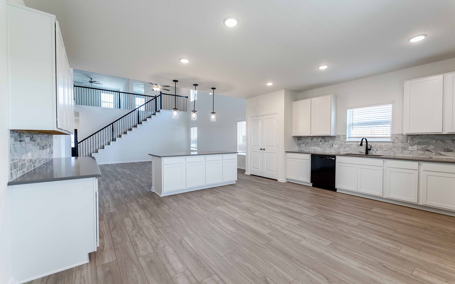 Every square foot is maximized with our Concho plan – the ideal home for the growing family. This 4-bedroom home offers space, flexibility and comfort. Entering your new home from your spacious porch, you are met with a foyer leading to your secluded study room. If you are looking for a little more living space, opt to transform the study room into your fifth bedroom! Travel further down the hall and you will discover the entry to your walk-in utility room and the convenient downstairs powder room. Need a little more room for your tools or holiday decorations? Luckily, the Concho plan bears an optional 2.5-car garage! Past the utility room, and you are led to the heart of the home - the open-concept, two-story family room adjoined by the oversized kitchen and breakfast area. The kitchen accommodates sleek granite countertops, flat-panel birch cabinets (with the option to add more), as well as a kitchen island! One of the most exclusive options this floor plan offers is the ability to add in an extended covered patio off the kitchen area. Talk about the perfect outdoor sanctuary! Finally, the first floor holds your private master suite with an elegant master bathroom. The master bathroom holds cultured marble countertops with the option of dual vanities, a shower/bathtub enclosure, and an expansive walk-in closet! If you are interested in taking the bathroom space to the next level you have the option to turn your bathtub into a super shower, or opt for a luxury tub with shower - both with standard dual vanities! Roam up the stairs to the second floor which is filled with three additional bedrooms, two full bathrooms and an oversized game room perfect for game nights with the family. In the Concho home, you will never have to sacrifice your space or comfort. There is something for the entire family to enjoy! With the copious amounts of included features and favorable options, you can bring your visions to life and will truly cherish your new CastleRock Concho home!