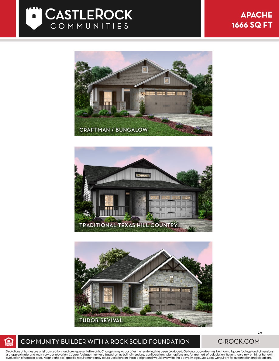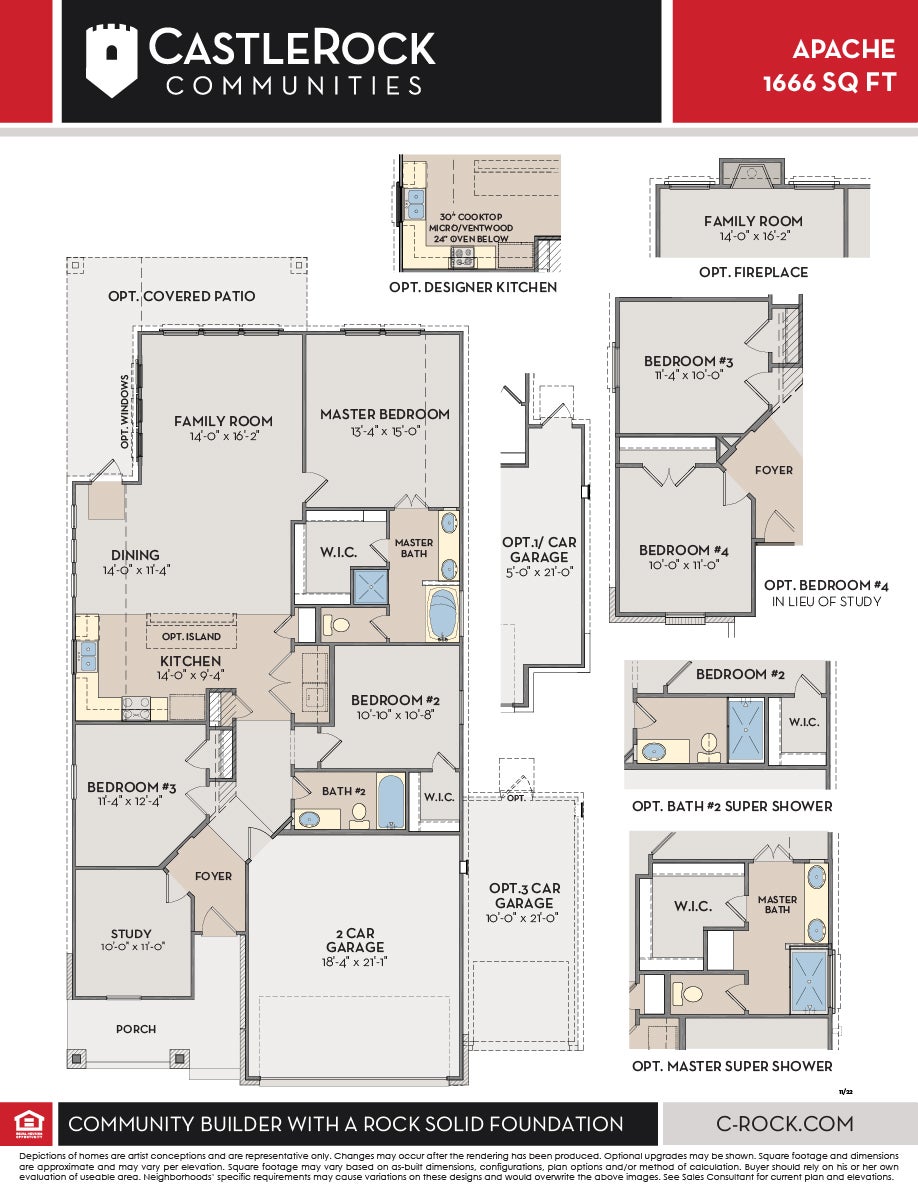 If you are looking for a classic floor plan, with just the right amount of options - our Apache plan is the home for you. Upon entering the home, you are greeted by a private study room with a door. Not interested in having a work space? Not to worry - transform the study into a fourth bedroom for when your friends and family come to visit you. Toward the start of the home and close to the private study (or the fourth bedroom) are the second and third bedrooms with the secondary bathroom being just across the way. With the secondary bathroom, you have the option of turning your bath tub/shower combination into a super shower! Beyond the wall of the secondary bath is the spacious two-car garage, where you have the ability to make it a three-car garage if you decide. Further down toward the back of the home, you will come across your state-of-the-art kitchen consisting of granite countertops, flat-panel birch cabinets, and the option to install a kitchen island giving you ample amount of counter space. Facing the kitchen is your combined dining room and family room areas. Never miss out on a moment with friends and family since the living area is an open-concept layout. Adding the flair and, of course, warmth to your family room, you can choose to have a fireplace installed. Not only does it keep you warm, but it certainly is that added touch that would elevate your home's style! The opportunities do not stop there. Your other options include a large covered patio in your backyard, perfect for sitting an enjoying your coffee in the mornings or barbecuing, and windows in your family room showing off natural light. Finally, the Apache home features a large master bedroom complimented by an equally impressive walk-in closet. Inside the master bathroom you will find double vanities, an expansive bathtub and a shower. If you want your bathroom to feel like an oasis, opt to turn your bathtub into a super shower! You deserve to feel relaxed and pampered in your new home.