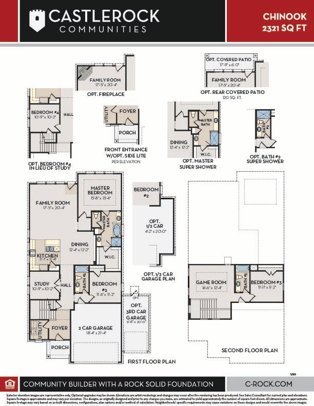 The Chinook floor plan has everything you need and more! This unique plan boasts an ideal layout of two stories, three bedrooms with three bathrooms. The exterior of this home is just as beautiful as the layout of the interior with an exclusive landscaping package offered, as well as the option to have a stone elevation versus brick. When you enter the home, you are immediately greeted by the walk-in utility room and stairs leading to the second floor. Across from the stairway, you will discover the guest bedroom with the full secondary bathroom residing just beside the bedroom. With the secondary bedroom, you can opt for a super shower. Next to the staircase is the private study room, where you can work in peace and escape the busyness of the combined dining, kitchen, and family room. If you desire, you can opt to transform your study room into a fourth bedroom. The kitchen features granite countertops, industry-leading appliances, birch cabinets, designer light fixtures, and plenty of room in your pantry to store all of your necessary items. Adjacent to the kitchen is the welcoming dining room attached with the large family room with an optional fireplace and access to an optional covered patio. This combination of rooms and covered patio proves to be the perfect layout for gatherings with friends and family. Just beyond the dining room and family room combination lies the master bedroom equipped with three windows for optimal natural light to stream inside. Accompanied with the master bedroom is the master bathroom holding dual separate vanities, a bathtub, as well as a stand alone shower and a generously-sized walk-in closet. If you prefer, you can decide to swap the bath for a large super shower instead! Upstairs, you are met with a gameroom the kids will love, joined by the third bedroom and bathroom. The Chinook home is complete with a two-car garage that you are able to alter to include another half-car or turn it into a three-car garage.