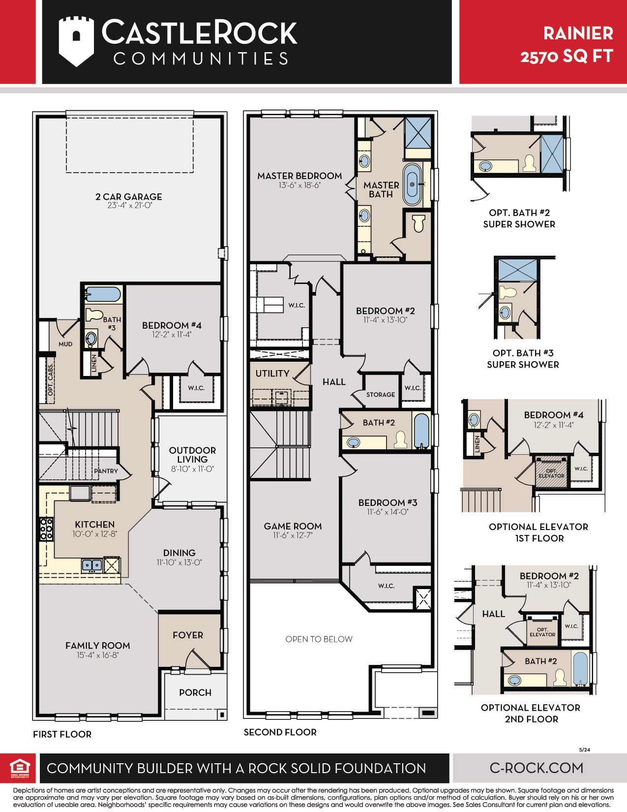 The Rainier floor plan offers a modern, spacious design that is sure to meet all of your needs. With four bedrooms and three bathrooms, this home offers plenty of space for a growing family, out-of-town guests, or even a home office. One of the standout features of the Rainier floor plan is its open-concept design. The kitchen, dining, and family room flow seamlessly together, creating an inviting space for entertaining and family time. The family room holds large windows that allow natural light to flood the room. The kitchen boasts a walk-in pantry, industry-leading appliances, and designer light fixtures making it the perfect space for preparing meals or hosting a gathering. The Rainier floor plan also includes a mudroom providing a convenient space to store shoes, coats, and other outdoor gear, keeping your home clutter-free and organized. Also on the first floor is an outdoor living space, along with a private bedroom & bathroom. The second floor offers even more space for your family to enjoy. The gameroom is perfect for indoor fun, with plenty of room for games, movies, or just hanging out. Conveniently, the utility room resides upstairs, along with the three remaining bedrooms and two bathrooms. The Rainier floor plan also includes several optional features that can be added to make your home even more customized to your needs. The second and third bathrooms can be upgraded to feature super showers, which offer a spa-like experience with luxurious showerheads and additional space. If you're looking for the perfect family home, look no further than the Rainier home.