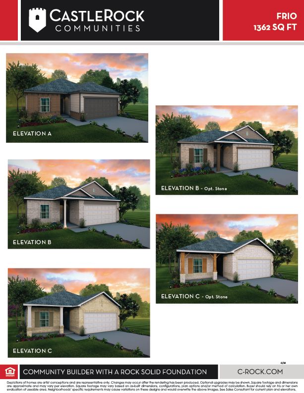 The Frio floor plan is as exciting for its features as it is for the tremendous value. A package of dynamite, this home boasts three bedrooms, two walk-in closets and two baths joined with a huge family room and a large kitchen/dining area. Upon entry of the home, you are met with access to your two-car garage. If you are needing the extra storage space, you are able to opt for an extra 1/2-car garage! You are then guided to the heart of the home - the sizable family room that faces the kitchen. This layout is ideal for hosting gatherings for all your friends and family. Opening up to the family room is your conveniently-designed kitchen and breakfast/dining room combination with entry to your walk-in utility room. The kitchen area is equipped with exclusive features like granite countertops, designer light fixtures, and flat-panel birch cabinets - these features alone are sure to please any crowd! Leading to your backyard from the breakfast/dining area, you can decide to include a covered patio if you like to get a breath of fresh air while being protected from the weather. The three large bedrooms are the perfect size for your family or guests when they come to visit. The second and third bedrooms are placed at the front of the home, with the third bedroom boasting a walk-in closet. The secondary bathroom lies conveniently between the two bedrooms. If you are looking to find the balance between work and play with a designated area to get things done, opt to transform the secondary bedroom into a study room! The option is yours. Lastly, the private master suite is secluded on the other end of the home and boasts a generously-sized master bathroom. The master bathroom is complete with cultured marble countertops with the option for dual vanities, a shower/bathtub enclosure, and a massive walk-in closet for you to enjoy! Upgrade your master bath to a master luxury bathtub with shower or an oversized super shower instead. You will cherish living in your Frio home!