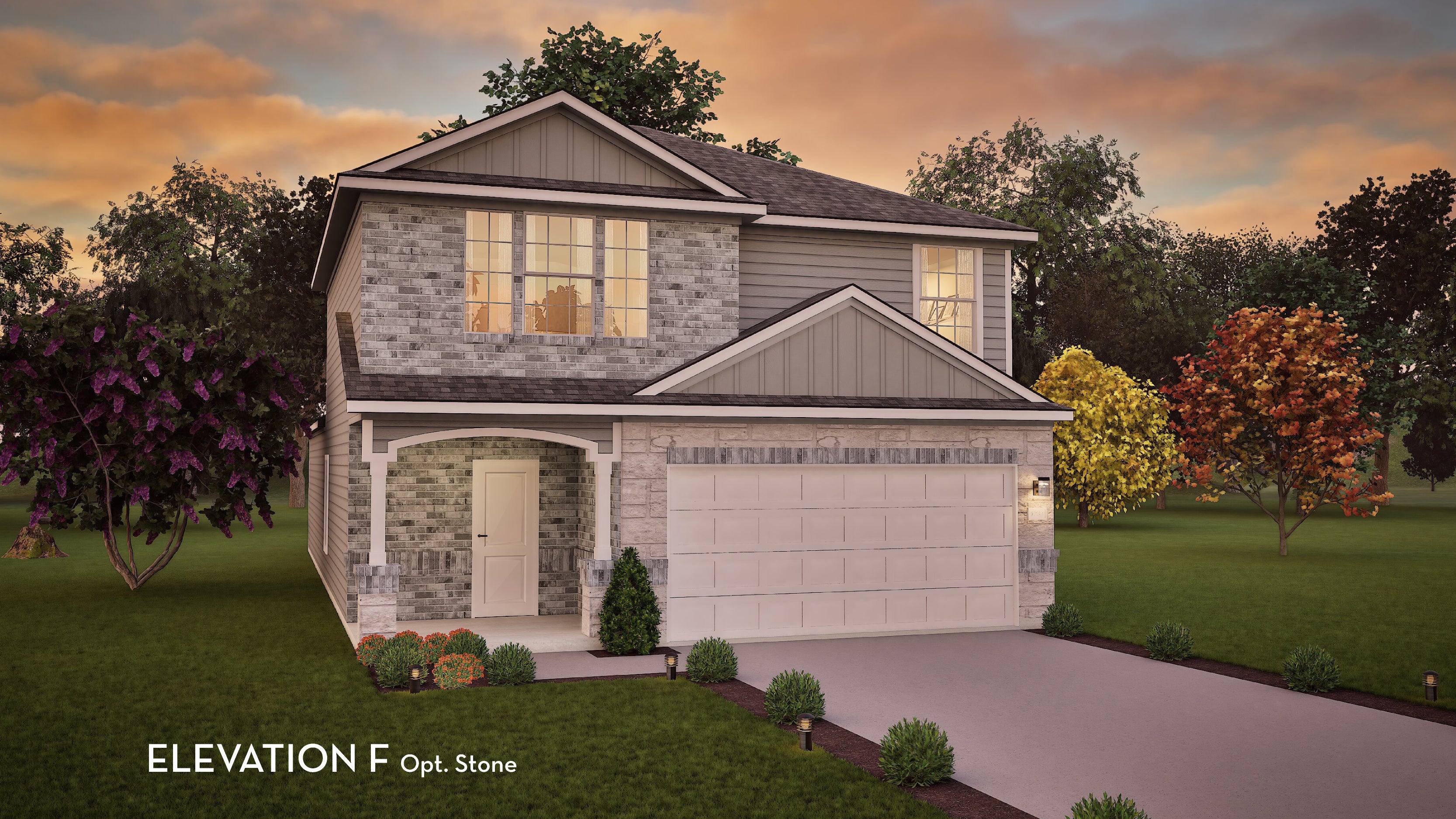 The delightful Ash floor plan is a sprawling, two-story design that is full of character. The exterior of the home is just as beautiful as the interior since the home will have a two-tone paint selection, and an exclusive landscaping package including shrubs, a caliper oak tree, and a yard that is fully sodded. Entering from your front porch, you are greeted by an elegant foyer with vinyl plank flooring that your two-car garage lies beside. Across the foyer is your convenient powder bathroom featuring a white pedestal sink and decorative mirror that flows right into your open-concept family room. The massive family room is perfect for entertaining guests and is boasting ample amount of space. The smell of fresh cookies baking can be experienced from the family room, since the kitchen is opened up facing the living area. The expansive kitchen area is completed with granite countertops, beautiful flat-panel birch cabinets, designer light fixtures, and industry-leading appliances. You will love having the ability to install a kitchen island in the center of the kitchen, if you are needing more counter space. Speaking of more space, your oversized walk-in pantry will come in handy when you need to store all your food, spices, and dog treats. Integrating with your kitchen is your welcoming formal dining space with entry to your backyard in the corner of the room. Giving your backyard added value, you have the option of including a sizable covered patio! Adjacent to your formal dining room is the large Master Bedroom. Leading off the bedroom is your gorgeous master bathroom complete with cabinetry that matches your kitchen selections, cultured marble bath countertops, LED down lighting, and a super shower. Up the stairs, you will come across a large gameroom that is ideal for family game nights, as well as three additional bedrooms, and a secondary full bathroom. The Ash floor plan is sure to fit most any family lifestyle.