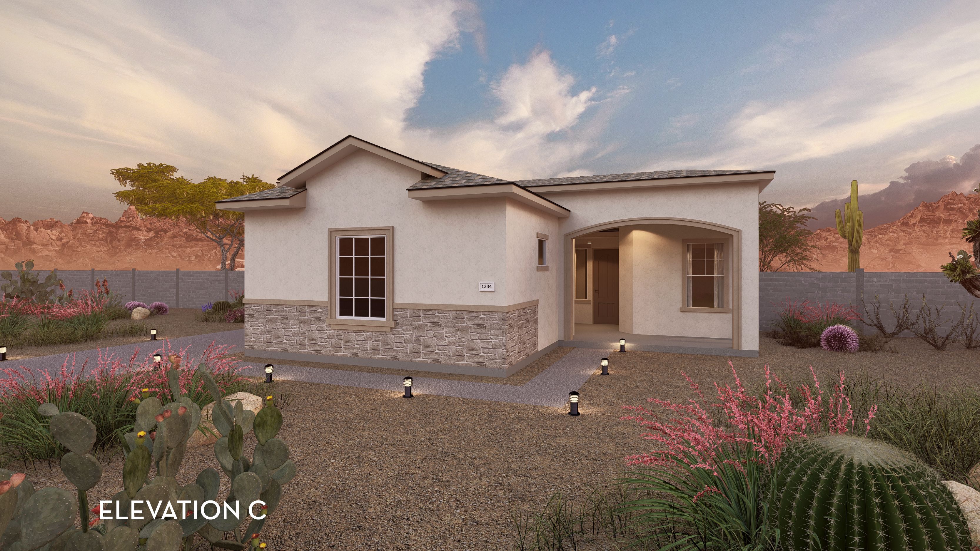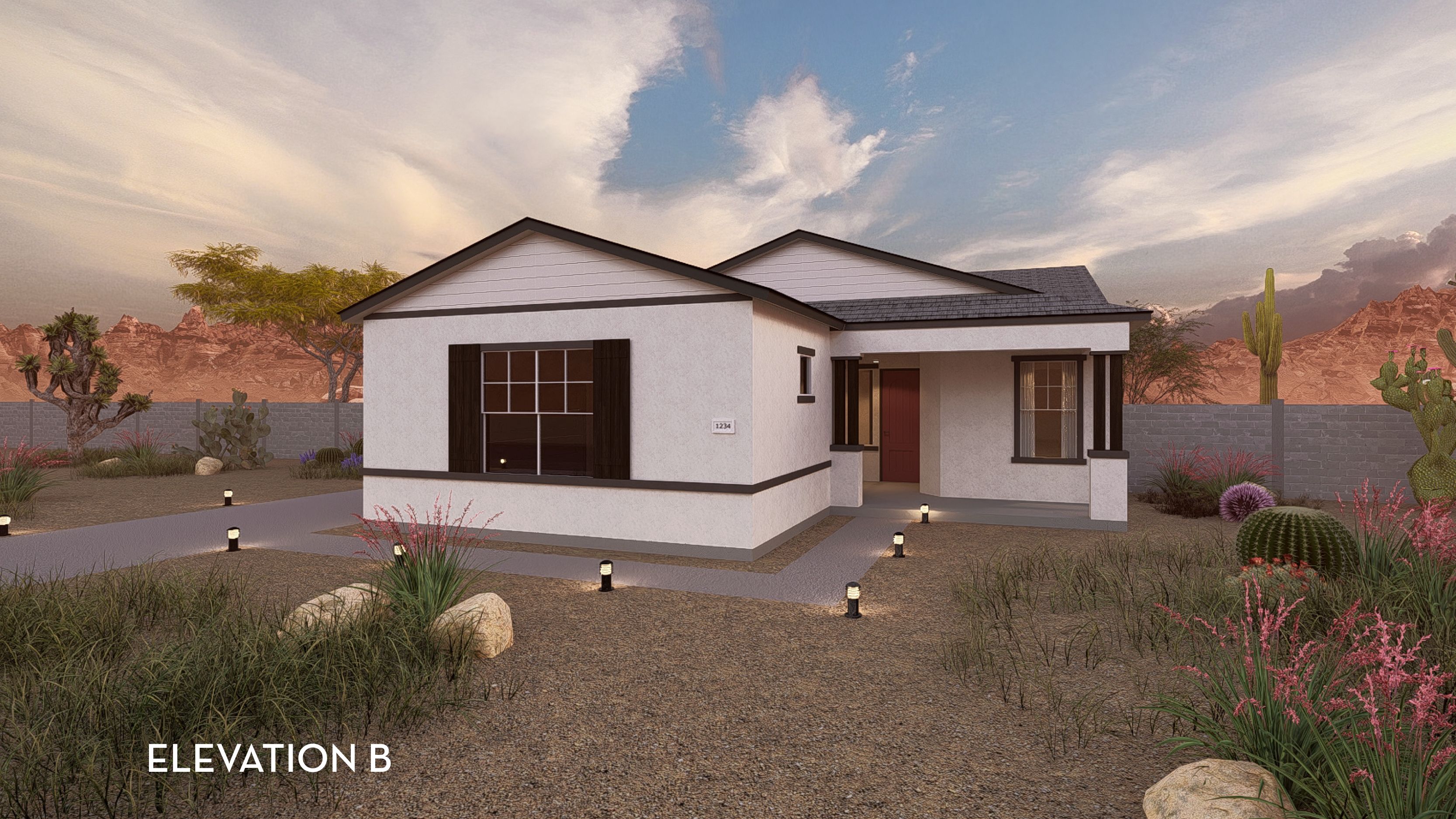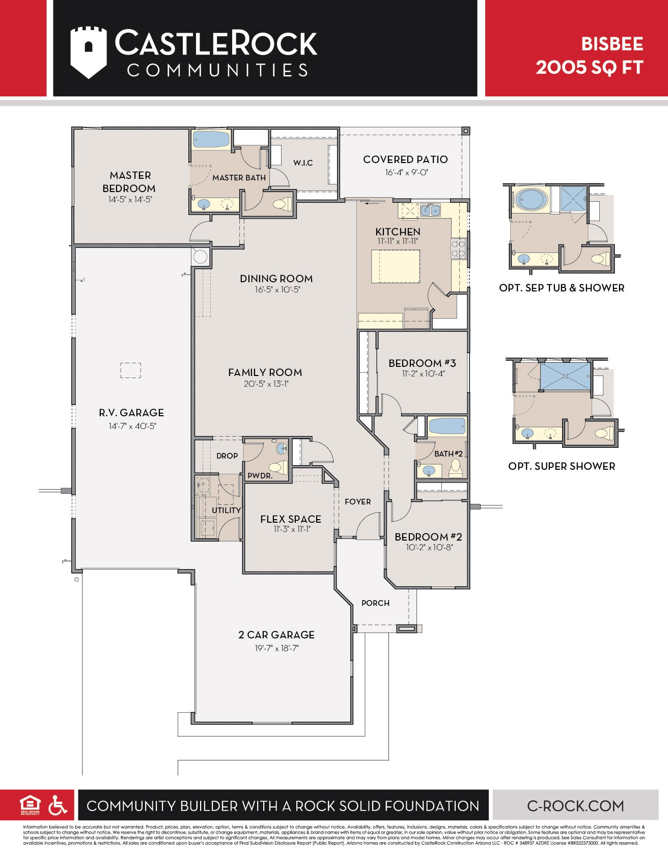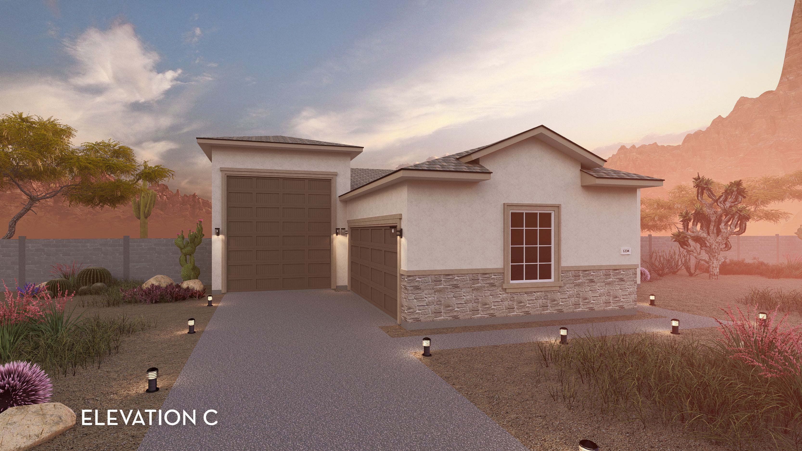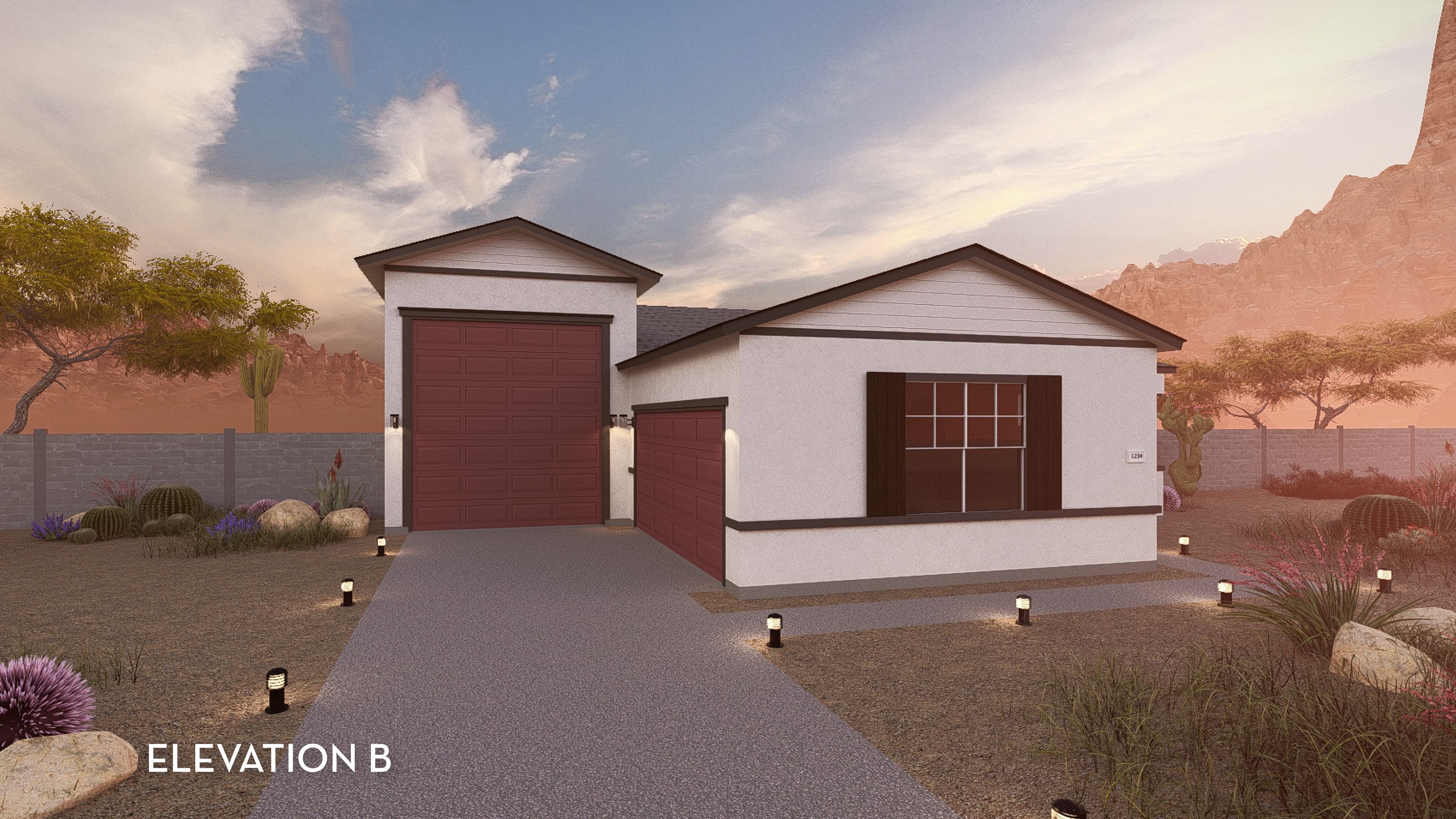 The Bisbee floor plan is the practical & unique design, perfect for those looking for adventure! A connected RV with sixteen-foot ceilings, a convenient drop zone ideal for tucking away coats, shoes, and equipment, as well as a flex room are just a few reasons you'll fall in love with this home. At the front of the home, the beautiful foyer leads you to the flex space, an area that would make an excellent home office or playroom for the kids. Across the hall are two bedrooms that share a full bath with a tub and shower combination. Wander down the hall where you'll be met with the family room that's connected to the dining room, ideal for hosting guests or spending quality time with the family. The family room and dining room are open to the kitchen. The kitchen is not only spacious but has everything you need and more. The island and oversized pantry allow for optimal storage and utility, while the granite countertops and designer lighting give the space an added level of comfort and beauty! Awaiting down the hall is the master suite boasting abundant natural light that makes this room feel cozy and comfortable. Connected is the master bathroom which is equipped with double vanities, a standard tub, a walk-in shower, and an oversized walk-in closet. Completing the home is the sizeable covered patio in the backyard. With several ways to customize this home to fit your lifestyle, the Bisbee is the perfect home for those who seek adventure and enjoy an open-concept layout.