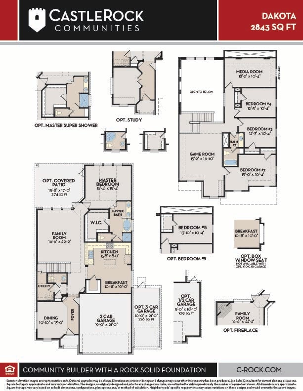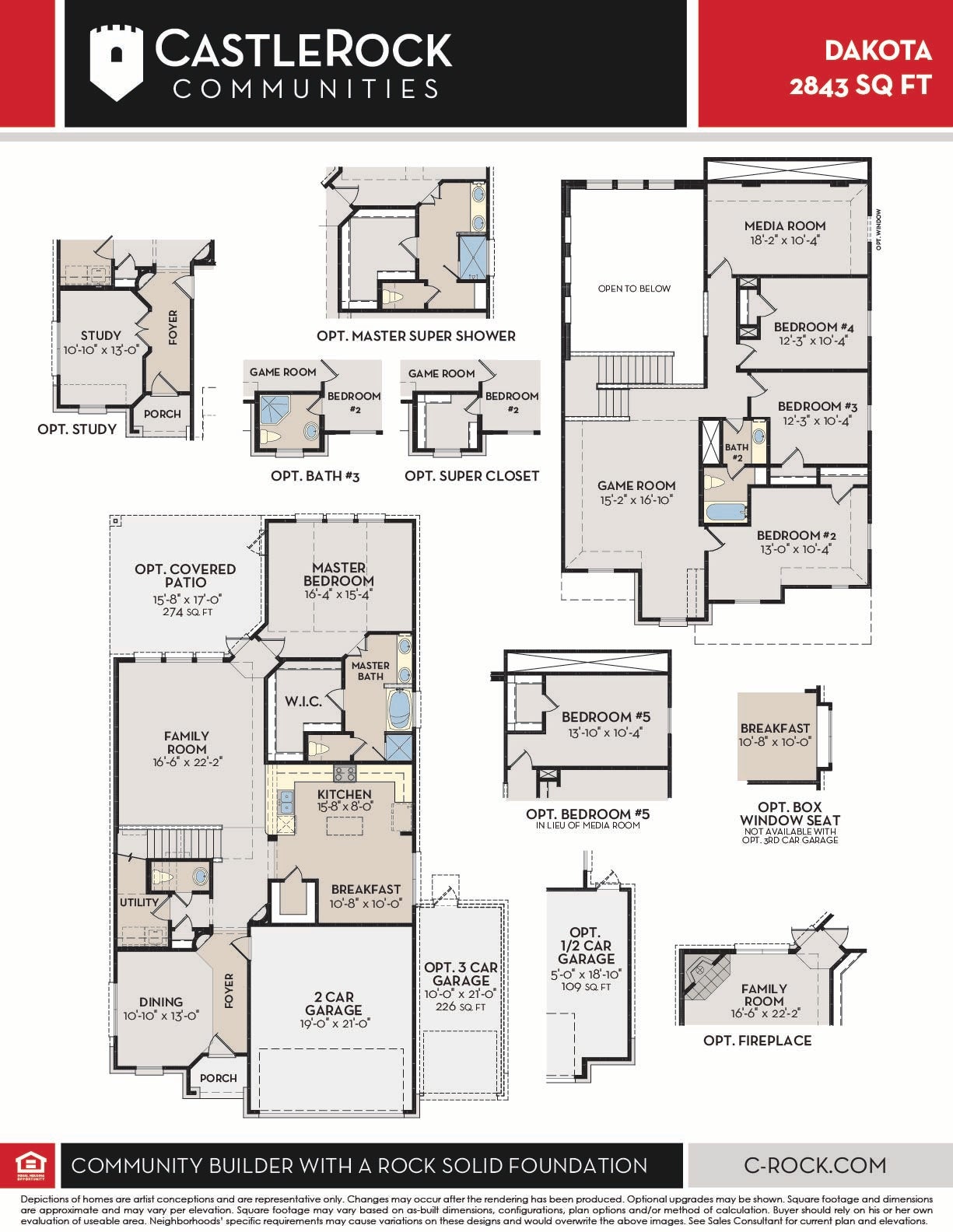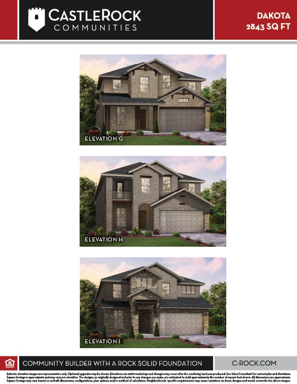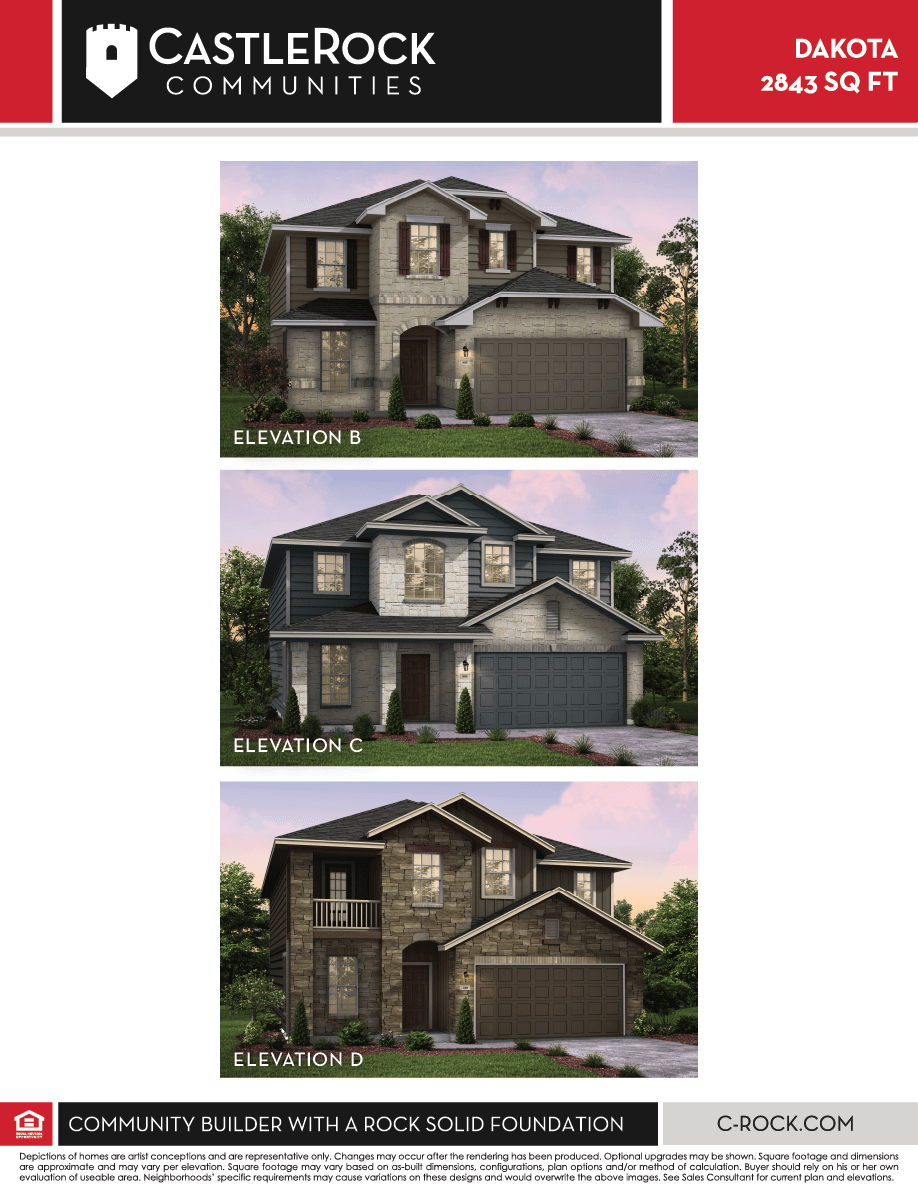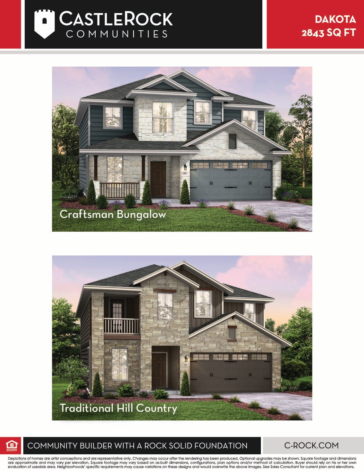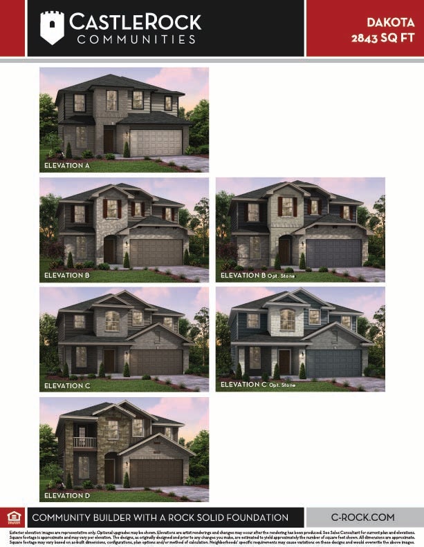 The Dakota is a wonderfully spacious home for families of any lifestyle. Entering the impressive Dakota plan, you are welcomed by a long foyer entry and are immediately greeted by your formal dining room - ideal for hosting dinner parties or your family for the holidays. If you'd rather have a private place to work from home, opt to make it a study room instead. Down the entryway is your convenient downstairs powder room, a walk-in utility room, and access to your two-car garage. Need more space to store tools, supplies, or another car? The Dakota gives you the opportunity to include an additional five feet to your garage or turn it into a three-car. Back inside, you are met with a spacious kitchen and a combined cozy, niche-style breakfast area that you can add a box window seat to, if you'd prefer. Your kitchen has fabulous features like granite countertops, designer light fixtures, flat-panel birch cabinets, and an oversized walk-in pantry! The large kitchen looks into the two-story family room that you can add a fireplace to in order to give the room that extra flair. From the family room, you also have access to your optional covered patio - perfect for backyard barbecues. Completing the first floor is the downstairs master suite that has a vaulted ceiling which adds to this home’s luxury feel. The master bathroom offers cultured marble countertops with dual vanities, a bathtub with a stand alone shower, and a huge walk-in closet. Upstairs, you will find a large gameroom that the kids will love, a captivating media room that you can turn into a fifth bedroom, and the three remaining bedrooms with the secondary bathroom beside the gameroom. The opportunities are limitless since the Dakota home offers numerous options to expand. You will never have to sacrifice comfort and flexibility with this floor plan. With the perfect amount of space, and options that the whole family can enjoy, you will definitely cherish each memory created within these walls.