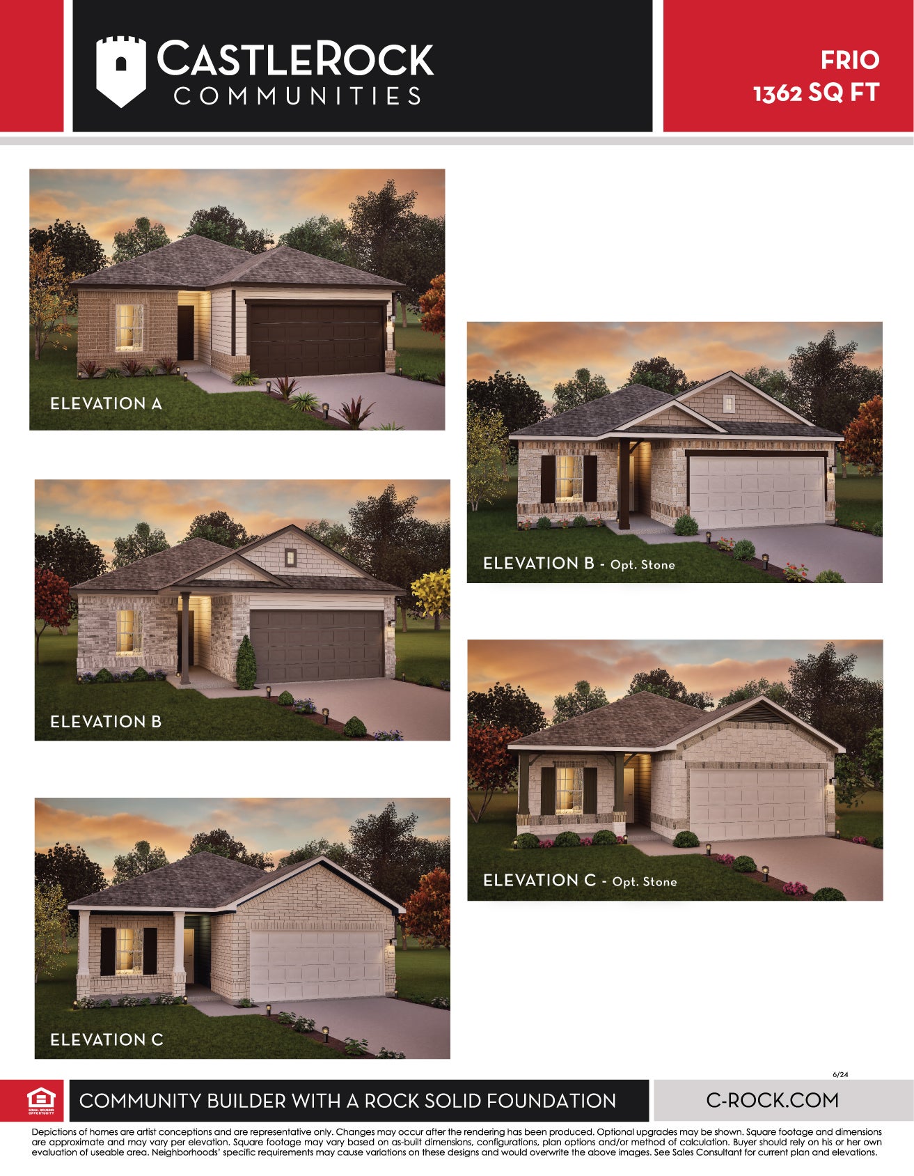 The Frio floor plan is as exciting for its features as it is for the tremendous value. A package of dynamite, this home boasts three bedrooms, two walk-in closets and two baths joined with a huge family room and a large kitchen/dining area. Upon entry of the home, you are met with access to your two-car garage. If you are needing the extra storage space, you are able to opt for an extra 1/2-car garage! You are then guided to the heart of the home - the sizable family room that faces the kitchen. This layout is ideal for hosting gatherings for all your friends and family. Opening up to the family room is your conveniently-designed kitchen and breakfast/dining room combination with entry to your walk-in utility room. The kitchen area is equipped with exclusive features like granite countertops, designer light fixtures, and flat-panel birch cabinets - these features alone are sure to please any crowd! Leading to your backyard from the breakfast/dining area, you can decide to include a covered patio if you like to get a breath of fresh air while being protected from the weather. The three large bedrooms are the perfect size for your family or guests when they come to visit. The second and third bedrooms are placed at the front of the home, with the third bedroom boasting a walk-in closet. The secondary bathroom lies conveniently between the two bedrooms. If you are looking to find the balance between work and play with a designated area to get things done, opt to transform the secondary bedroom into a study room! The option is yours. Lastly, the private master suite is secluded on the other end of the home and boasts a generously-sized master bathroom. The master bathroom is complete with cultured marble countertops with the option for dual vanities, a shower/bathtub enclosure, and a massive walk-in closet for you to enjoy! Upgrade your master bath to a master luxury bathtub with shower or an oversized super shower instead. You will cherish living in your Frio home!
