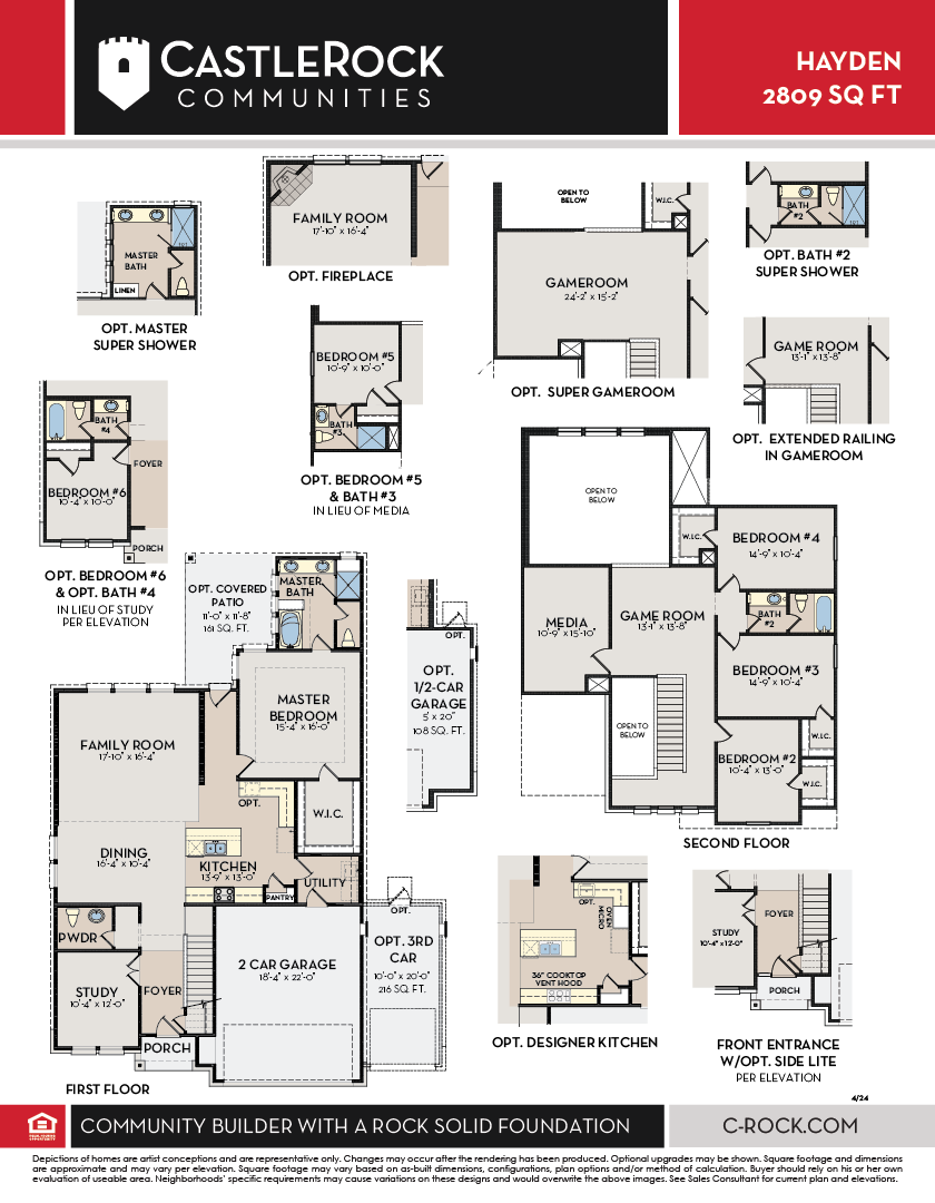The exciting, two-story Hayden home offers plenty of flex space with bright and airy rooms. Upon entering this home, you are greeted with the stairway to your second floor, as well as your convenient downstairs powder bathroom and entry to your private study room. You can opt to turn the study room into a bedroom if you need extra space for guests. Traveling down the foyer, you will be captivated by the open-concept layout that flows from the two-story family room to the inviting dining space and spacious kitchen. This area boasts a ton of options such as an appealing fireplace for your family room, and an extra sink in your kitchen to serve as a wet bar! This layout is perfect for entertaining gatherings of any size. Your kitchen also comes with attractive features like sleek granite countertops, ceramic tile backsplash, industry-leading appliances, and a kitchen island! Right off the kitchen is entry to your walk-in utility and your two-car garage. You can even add on extra space, turning your garage into a two-and a half car or three-car garage! For those that love spending quality time with family outdoors, the Hayden plan gives you the ability to include a sizable covered patio in your backyard. Back inside, you are met with your deluxe master retreat featuring a huge walk-in closet and a divine master bathroom. Your master bathroom features dual vanities, a bathtub and a stand alone shower that you can transform into a super shower if you desire. Head upstairs where fun for the whole family resides. Your second floor was built for game night and family fun sporting a media and game room that you can supersize. Additionally, upstairs holds your second, third and fourth bedrooms all containing large walk-in closets, as well as your secondary bathroom. Need another bedroom to accommodate your family? Switch out the media room for another bedroom. The Hayden is the ideal space for families of any size. You will love the space and comfort this home provides.