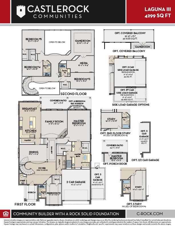 This sprawling Laguna III floor plan will sweep you off your feet. Space is no issue in this five-bedroom, four-and-a-half bathroom home. The grand foyer boasts a beautiful spiral staircase, a convenient downstairs powder bathroom, a guest bedroom that you can transform into a secluded study room, the entry to your walk-in utility room and your two-car garage. You can even opt to include an extra half-car space in the garage for storing your tools and supplies or a two or three-car side load garage. The elegant gallery leads you to your welcoming formal dining room and your two-story family room that opens up to the island kitchen and conjoined breakfast room. Your kitchen is nothing short of luxurious with granite countertops, an island, and a huge walk-in pantry and butler's pantry allowing more storage space. Right off the breakfast room is the entry to your massive covered patio, perfect for spending time outdoors. Enjoy relaxing in your luxurious master suite with dual walk-in closets and double separate vanities. Upgrade your master bedroom by opting for an elegant bay window letting the natural light stream through, or add a door to your covered patio - the choice is yours. Up the grand staircase is a gameroom that your guests will love having game nights in, as well as an attached cozy media room that is perfect for movie nights at home with the family. Additionally, you are met with the three remaining bedrooms with walk-in closets and two full bathrooms. If you are not needing an extra bedroom, feel free to transform the fourth bedroom into a study room. Take your second story to new heights with the option of a covered balcony that all your friends and family can enjoy. The Laguna III boasts incredible options and desirable included features that will accommodate most any lifestyle. With this layout, you can personalize your Laguna III home the way you have always envisioned. Rest assured, you'll fall in love with this home and the open-concept layout.