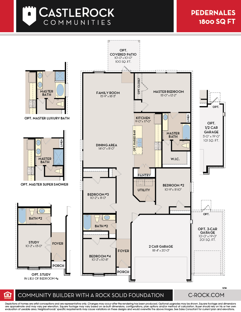 The exciting Pedernales floor plan boasts a four bedroom, two bathroom single-story home. Upon entering this outstanding home, you are met with a foyer area with access to your fourth bedroom at the front of the home. In need of a secluded work from home space or an area for the kids to do their homework? Transform the fourth bedroom in to a study room for your convenience. A little further down the hall and you will discover your third bedroom with the full secondary bathroom residing between the two bedrooms. You will also find access to your garage. If you are needing ample storage space, you are in luck! A two-and-a-half-car garage comes standard in this floor plan. Around the corner from the garage is your sizable walk-in utility room, as well as your second bedroom. At the heart of your home is the uniquely-designed combined family room and dining area that your friends and family are sure to enjoy. Never miss out on any conversations with guests, since the open-concept kitchen area opens up to the combined family room and dining area, making hosting guests for the holiday a breeze. Your kitchen comes fully equipped with ample counterspace featuring granite countertops with a ceramic tile backsplash, a kitchen island with the option to raise the bar for additional seating underneath, industry-leading appliances, and an oversized, walk-in pantry. You will love entertaining guests in this home! The door from your family room leads to your optional covered patio - perfect for relaxing outdoors or grilling out for your friends and family. Retreat to your master suite where you can relax in your master bathroom. The master bathroom is complete with a shower/tub enclosure, the option for dual vanities, as well as the option for two closets - one of them being a walk-in closet! If you want to enhance your master bathroom, opt to include a master luxury bath or a super shower featuring standard dual vanities instead. The opportunities in the Pedernales are limitless!
