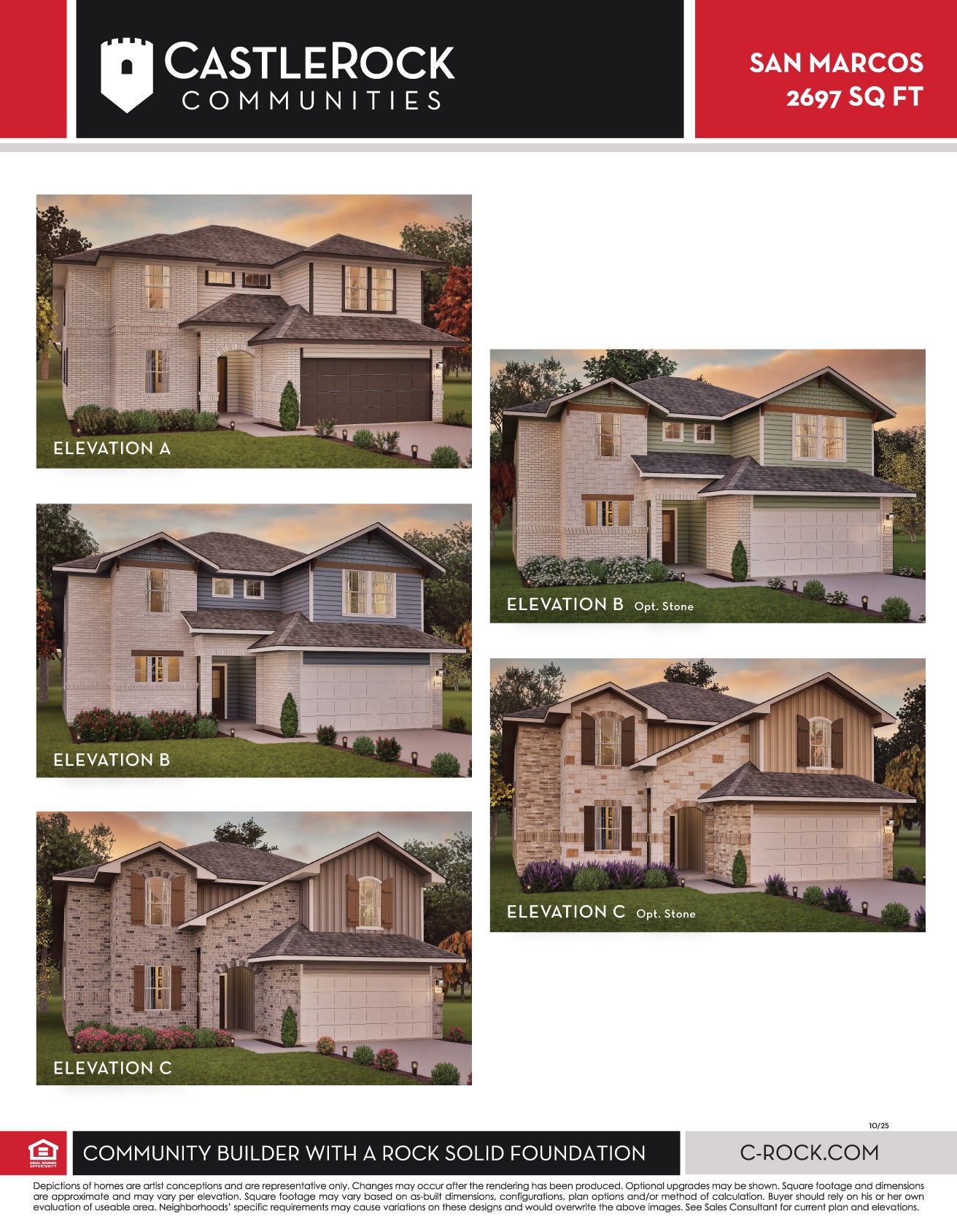 A contemporary design with traditional elements, the San Marcos plan offers a unique layout that suits most any lifestyle. As soon as you enter this elegant home, you are met with the convenient downstairs powder room, a walk-in utility room, and a beneficial computer niche that connects to your spacious kitchen. You are also met with your two-car garage that you can transform into a three-car garage perfect for another vehicle or serving as an excellent storage space. Amidst your elegant staircase is the curved dining area that adds a custom feel to this innovative design. Across from the unique dining space is the kitchen featuring granite countertops, a walk-in pantry room, a raised bar perfect for when the kids eat breakfast each morning, as well as the option for a kitchen island if you are needing additional counterspace. The kitchen opens up into the massive family room, creating a great space for entertaining gatherings of any size for any occasion. If you crave quality time spent outdoors, the San Marcos plan offers you the option of a huge covered patio that your whole family and friends can enjoy. Completing the first floor is your secluded master suite. Your master bathroom is complete with separated dual vanities with cultured marble countertops, a bathtub, a stand-alone shower, and an enormous walk-in closet. Enhance your master bathroom by including a super shower instead of a bathtub! Wander up the stairs, where you will find a perfectly-sized gameroom for the kids to have a sanctuary of their own or host game nights with friends. Each bedroom has a unique quality that gives them optimal value. The second bedroom is the largest allows a third bathroom if you prefer, the third bedroom boasts a convenient sitting area/flex space, and the fourth bedroom sits secluded from the others right beside the gameroom. Between the third and fourth bedrooms is the secondary full bathroom with the option for dual vanities. You will love the San Marcos!