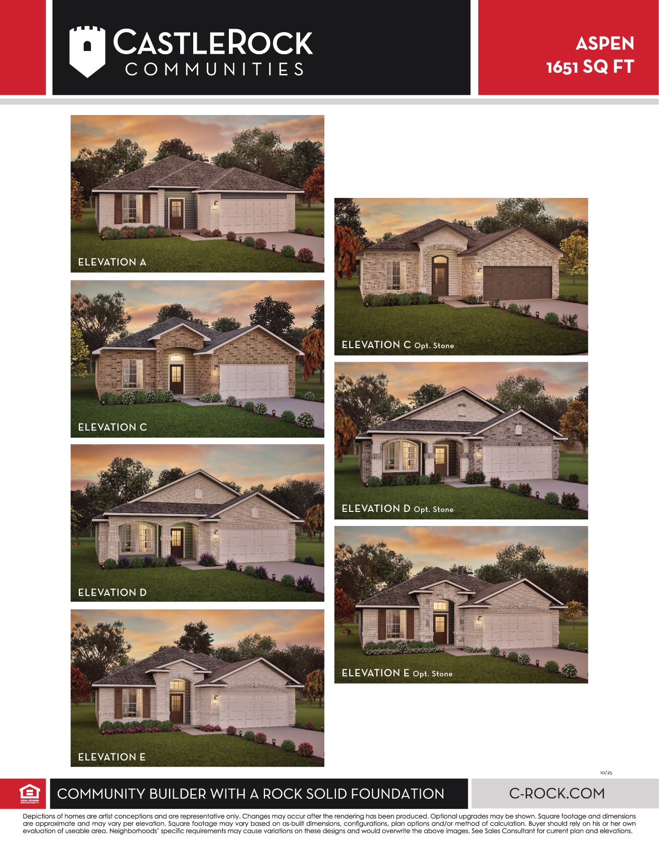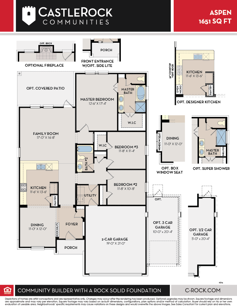 The inspirational Aspen floor plan boasts three bedrooms, and two full bathrooms - the perfect home layout. The spacious two-car garage can serve as a space to park your cars, or cater to your storage needs by transforming it into a 2.5- or 3-car garage. Opening up the door to your new home, you will come across a decorative bookshelf inside your foyer, that brings that added stylish touch to your home. Just past the bookshelves is the welcoming formal dining room. You will love getting to entertain guests for dinner, since the conversation will stay flowing into the kitchen area. Want more natural light streaming in? You can have a box window seat installed just off the side of the dining, providing extra sunlight. The Aspen kitchen holds exclusive features like industry-leading appliances, designer light fixtures, granite countertops, and flat-panel birch cabinets. You also have a sizable pantry and expansive amount of counterspace to work with, making the space more convenient for you. Down the hall and overlooking the kitchen is the open-concept family room. This living area is a comfortable size with plenty of room for your furniture and your guests. You can also decide to install a gas log fireplace, should you desire to. Convenience does not stop there - in your backyard, you have the option of including a large covered patio for your leisure! Last but not least is your very private Master Bedroom. Your bedroom opens up to your Master Bathroom where your bathtub and single shower reside. Looking to bring luxury to a whole other level? Opt to transform your tub and shower into a super shower fit for a king with shelving right beside. Also in your Master Bathroom, your cabinets will match your selections from the kitchen cabinets, and there is LED down lighting above both vanities/sink areas. With the wide variety of options available and exclusive features offered, we are positive you will be beyond excited to move into your CastleRock Aspen home!