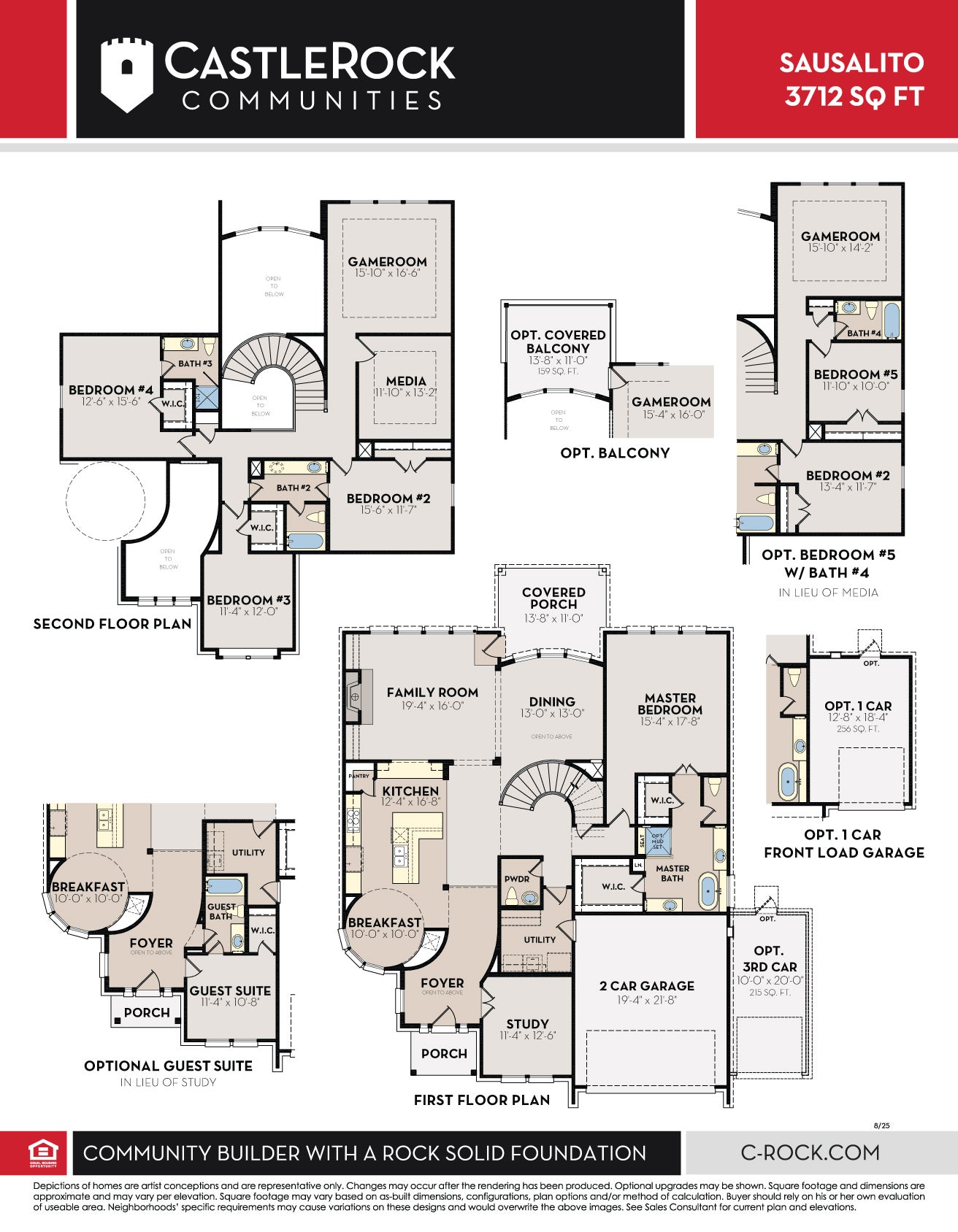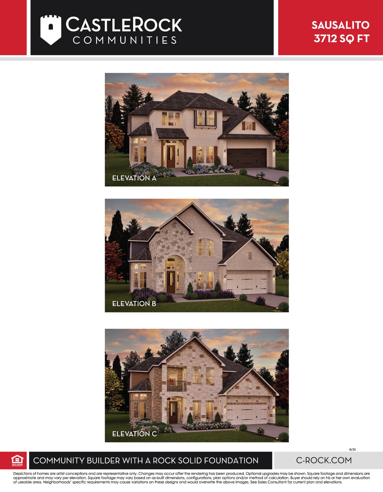 The Sausalito floor plan is a sophisticated design packed with custom elements. The rounded breakfast area, spiral staircase, and two story dining room make an impressive statement in this stunning four bedroom design. Entering this home, you are met with a secluded study room that you can turn into a guest suite with an attached bathroom and walk-in closet. Next you are greeted by the integrated kitchen and breakfast area that opens up to the formal dining and large family room, making entertaining guests a breeze. Your kitchen features many attractive elements like granite countertops, a kitchen island, and a spacious pantry. For those who like to spend ample time outdoors, the large covered patio is the perfect sanctuary for you to relax under. Adjacent to your beautiful sweeping staircase is your convenient downstairs powder bathroom, as well as your walk-in utility room and access to your two-car garage. Choose to expand your garage by including space for a third vehicle or a half-space for additional storage. You can also choose to have a two or three-car side load garage instead. Retreat to your master suite that gives you the option of including a bay window allowing for abundant natural light to seep through. The master en-suite bathroom features double walk-in closets, dual vanities, and a large soaker tub with a separate shower. Wander to the second story where you will discover a gameroom that the kids will love, a secondary bathroom, and a cozy media room that is perfect for family movie nights at home. You will also find the third bedroom and the fourth bedroom with an attached full bathroom and each containing walk-in closets. You can also swap out the secondary bathroom tub/shower into a super shower if you prefer! Needing an extra bedroom for guests? Switch out the media room for a fifth bedroom and fourth bathroom to accommodate your needs. You can also include a covered balcony for everyone to enjoy!. You will love living in your Sausalito home!
